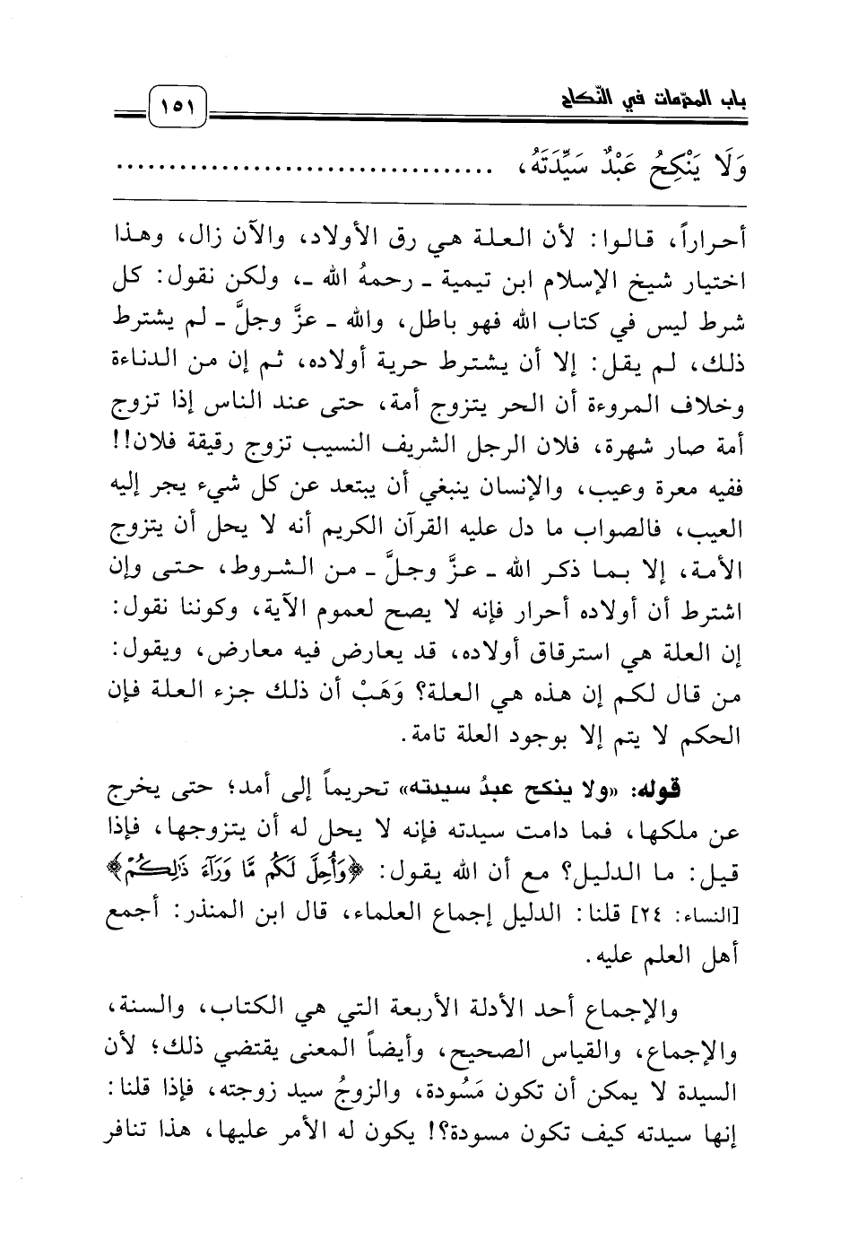 أحراراً، قالوا: لأن العلة هي رق الأولاد، والآن زال، وهذا اختيار شيخ الإسلام ابن تيمية ـ رحمه الله ـ، ولكن نقول: كل شرط ليس في كتاب الله فهو باطل، والله ـ عزّ وجل ـ لم يشترط ذلك، لم يقل: إلا أن يشترط حرية أولاده، ثم إن من الدناءة وخلاف المروءة أن الحر يتزوج أمة، حتى عند الناس إذا تزوج أمة صار شهرة، فلان الرجل الشريف النسيب تزوج رقيقة فلان!! ففيه معرة وعيب، والإنسان ينبغي أن يبتعد عن كل شيء يجر إليه العيب، فالصواب ما دل عليه القرآن الكريم أنه لا يحل أن يتزوج الأمة، إلا بما ذكر الله ـ عزّ وجل ـ من الشروط، حتى وإن اشترط أن أولاده أحرار فإنه لا يصح لعموم الآية، وكوننا نقول: إن العلة هي استرقاق أولاده، قد يعارض فيه معارض، ويقول: من قال لكم إن هذه هي العلة؟ وَهَبْ أن ذلك جزء العلة فإن الحكم لا يتم إلا بوجود العلة تامة.