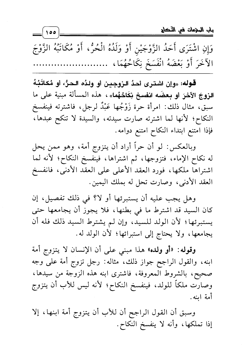 قوله: «وإن اشترى أحدُ الزوجين أو ولدُه الحرُّ، أو مُكاتَبُهُ الزوجَ الآخرَ أو بعضَه انفسخ نِكَاحُهُما»، هذه المسألة مبنية على ما سبق، مثال ذلك: امرأة حرة زَوْجُها عَبْدٌ لرجل، فاشترته فينفسخ النكاح؛ لأنها لما اشترته صارت سيدته، والسيدة لا تنكح عبدها، فإذا امتنع ابتداء النكاح امتنع دوامه.
