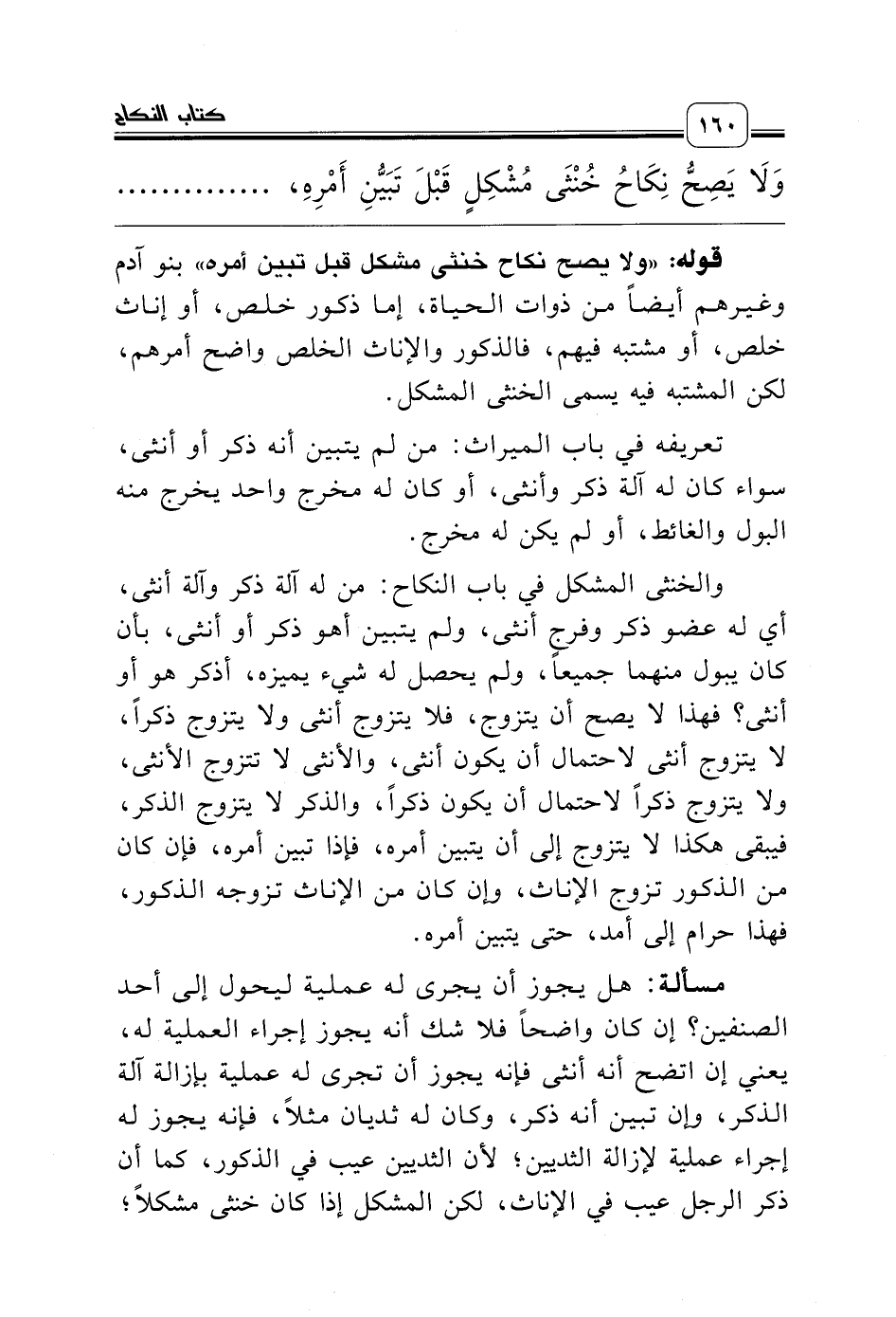 والخنثى المشكل في باب النكاح: من له آلة ذكر وآلة أنثى، أي له عضو ذكر وفرج أنثى، ولم يتبين أهو ذكر أو أنثى، بأن كان يبول منهما جميعاً، ولم يحصل له شيء يميزه، أذكر هو أو أنثى؟ فهذا لا يصح أن يتزوج، فلا يتزوج أنثى ولا يتزوج ذكراً، لا يتزوج أنثى لاحتمال أن يكون أنثى، والأنثى لا تتزوج الأنثى، ولا يتزوج ذكراً لاحتمال أن يكون ذكراً، والذكر لا يتزوج الذكر، فيبقى هكذا لا يتزوج إلى أن يتبين أمره، فإذا تبين أمره، فإن كان من الذكور تزوج الإناث، وإن كان من الإناث تزوجه الذكور، فهذا حرام إلى أمد، حتى يتبين أمره.