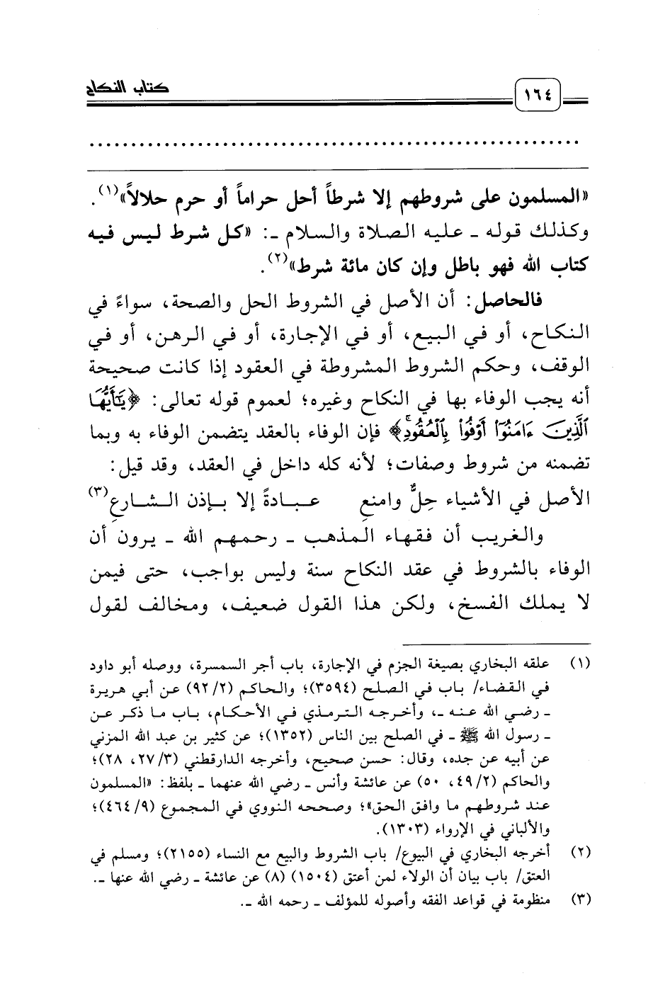 «المسلمون على شروطهم إلا شرطاً أحل حراماً أو حرم حلالاً» (¬1). وكذلك قوله ـ عليه الصلاة والسلام ـ: «كل شرط ليس فيه كتاب الله فهو باطل وإن كان مائة شرط» (¬2).