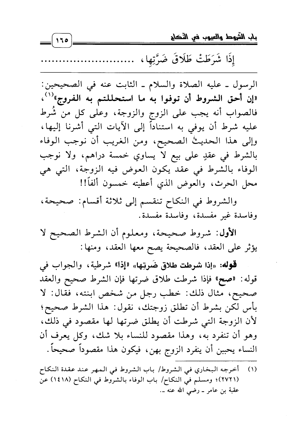 (¬1) أخرجه البخاري في الشروط/ باب الشروط في المهر عند عقدة النكاح (2721)؛ ومسلم في النكاح/ باب الوفاء بالشروط في النكاح (1418) عن عقبة بن عامر ـ رضي الله عنه ـ.