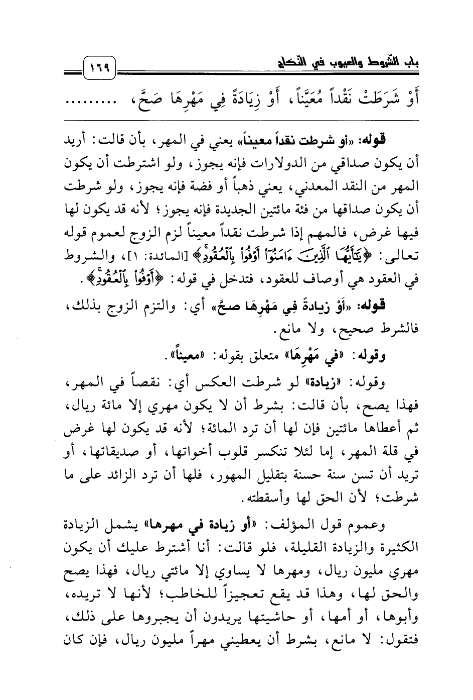 قوله: «أو شرطت نقداً معيناً» يعني في المهر، بأن قالت: أريد أن يكون صداقي من الدولارات فإنه يجوز، ولو اشترطت أن يكون المهر من النقد المعدني، يعني ذهباً أو فضة فإنه يجوز، ولو شرطت أن يكون صداقها من فئة مائتين الجديدة فإنه يجوز؛ لأنه قد يكون لها فيها غرض، فالمهم إذا شرطت نقداً معيناً لزم الزوج لعموم قوله تعالى: {يَاأَيُّهَا الَّذِينَ آمَنُوا أَوْفُوا بِالْعُقُودِ} [المائدة: 1]، والشروط في العقود هي أوصاف للعقود، فتدخل في قوله: {أَوْفُوا بِالْعُقُودِ}.