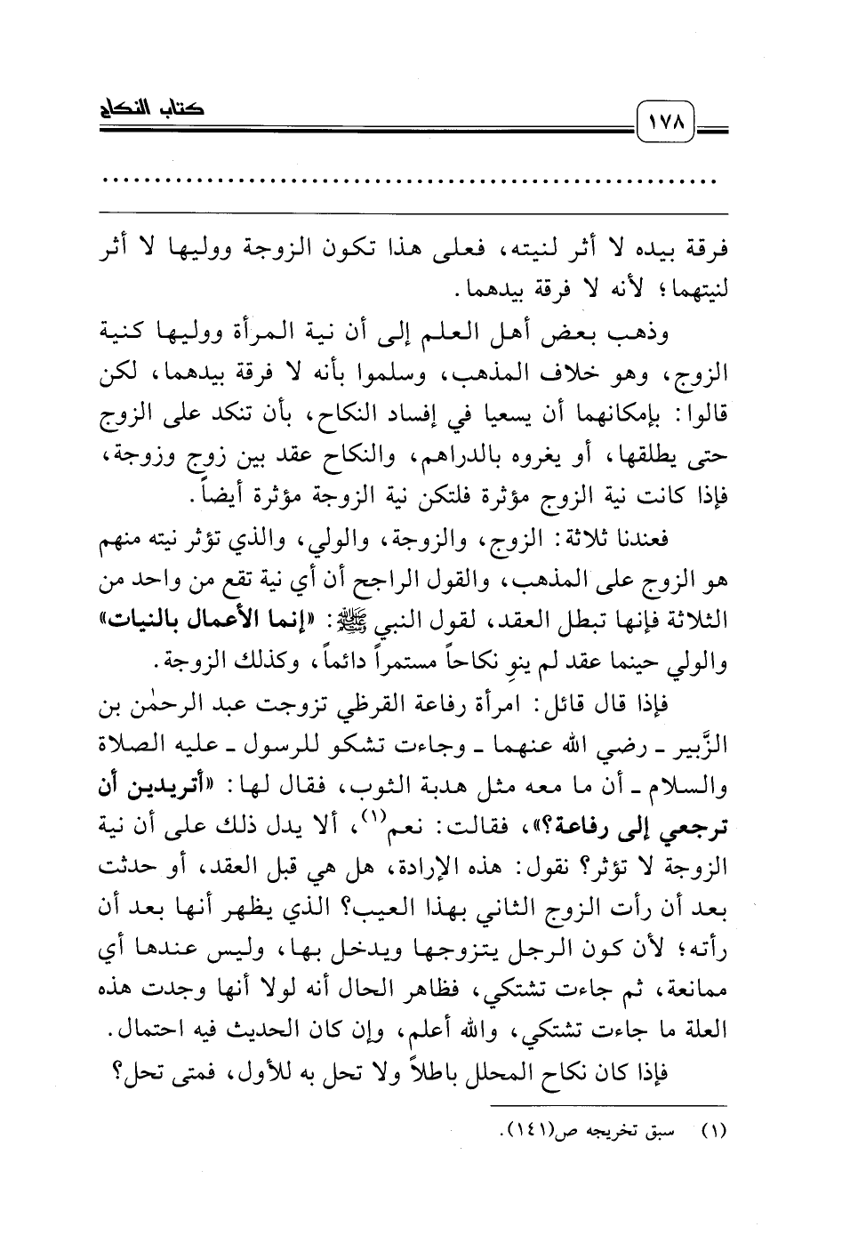 فإذا قال قائل: امرأة رفاعة القرظي تزوجت عبد الرحمن بن الزَّبير ـ رضي الله عنهما ـ وجاءت تشكو للرسول ـ عليه الصلاة والسلام ـ أن ما معه مثل هدبة الثوب، فقال لها: «أتريدين أن ترجعي إلى رفاعة؟»، فقالت: نعم (¬1)، ألا يدل ذلك على أن نية الزوجة لا تؤثر؟ نقول: هذه الإرادة، هل هي قبل العقد، أو حدثت بعد أن رأت الزوج الثاني بهذا العيب؟ الذي يظهر أنها بعد أن رأته؛ لأن كون الرجل يتزوجها ويدخل بها، وليس عندها أي ممانعة، ثم جاءت تشتكي، فظاهر الحال أنه لولا أنها وجدت هذه العلة ما جاءت تشتكي، والله أعلم، وإن كان الحديث فيه احتمال.