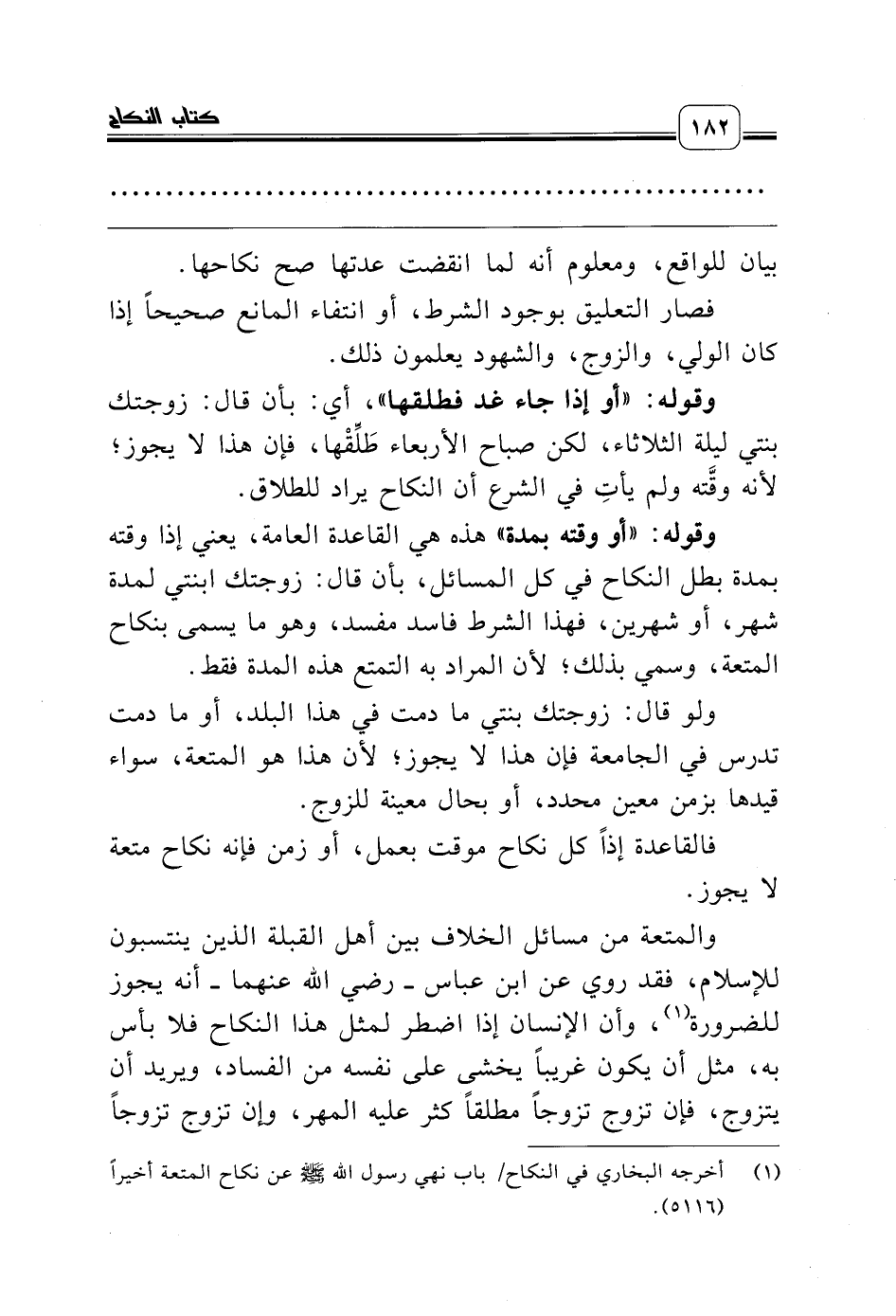 وقوله: «أو وقته بمدة» هذه هي القاعدة العامة، يعني إذا وقته بمدة بطل النكاح في كل المسائل، بأن قال: زوجتك ابنتي لمدة شهر، أو شهرين، فهذا الشرط فاسد مفسد، وهو ما يسمى بنكاح المتعة، وسمي بذلك؛ لأن المراد به التمتع هذه المدة فقط.