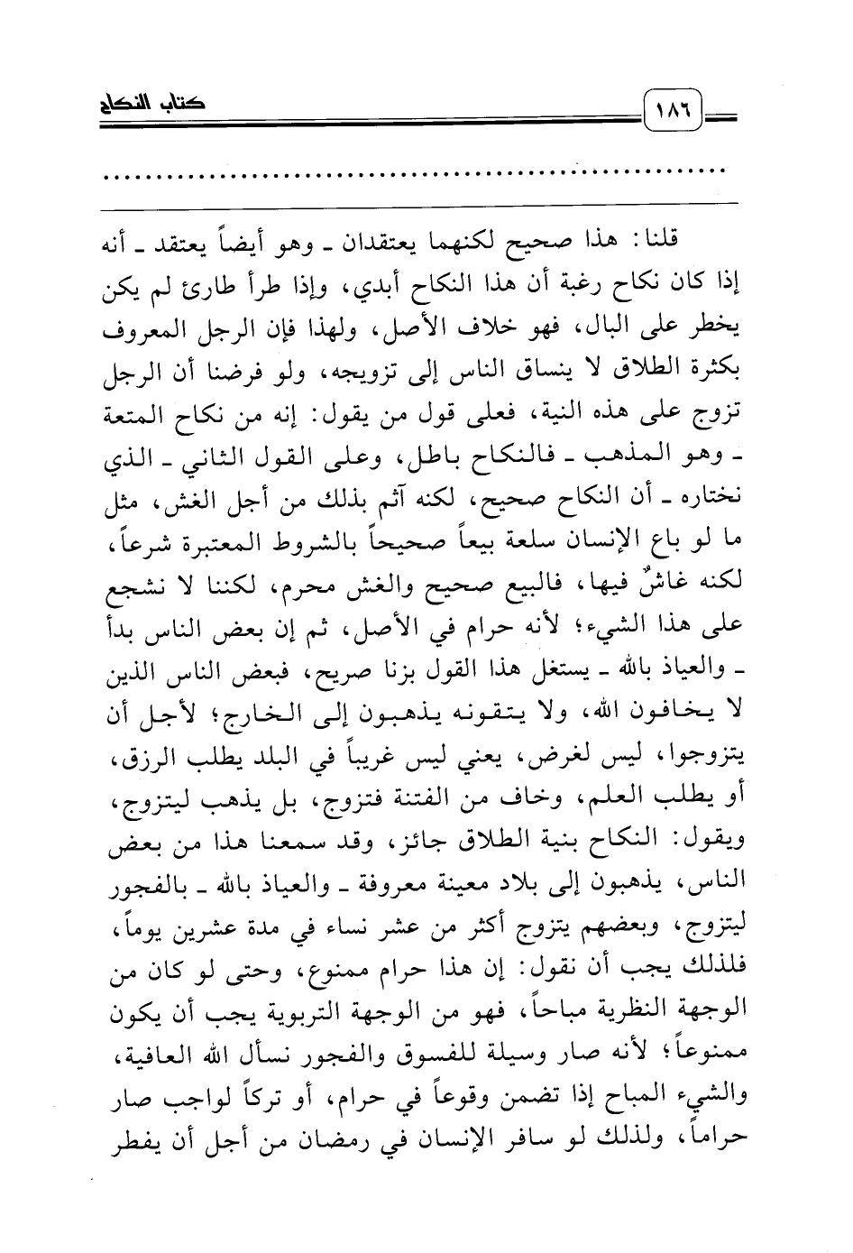 قلنا: هذا صحيح لكنهما يعتقدان ـ وهو أيضاً يعتقد ـ أنه إذا كان نكاح رغبة أن هذا النكاح أبدي، وإذا طرأ طارئ لم يكن يخطر على البال، فهو خلاف الأصل، ولهذا فإن الرجل المعروف بكثرة الطلاق لا ينساق الناس إلى تزويجه، ولو فرضنا أن الرجل تزوج على هذه النية، فعلى قول من يقول: إنه من نكاح المتعة ـ وهو المذهب ـ فالنكاح باطل، وعلى القول الثاني ـ الذي نختاره ـ أن النكاح صحيح، لكنه آثم بذلك من أجل الغش، مثل ما لو باع الإنسان سلعة بيعاً صحيحاً بالشروط المعتبرة شرعاً، لكنه غاشٌ فيها، فالبيع صحيح والغش محرم، لكننا لا نشجع على هذا الشيء؛ لأنه حرام في الأصل، ثم إن بعض الناس بدأ ـ والعياذ بالله ـ يستغل هذا القول بزنا صريح، فبعض الناس الذين لا يخافون الله، ولا يتقونه يذهبون إلى الخارج؛ لأجل أن يتزوجوا، ليس لغرض، يعني ليس غريباً في البلد يطلب الرزق، أو يطلب العلم، وخاف من الفتنة فتزوج، بل يذهب ليتزوج، ويقول: النكاح بنية الطلاق جائز، وقد سمعنا هذا من بعض الناس، يذهبون إلى بلاد معينة معروفة ـ والعياذ بالله ـ بالفجور ليتزوج، وبعضهم يتزوج أكثر من عشر نساء في مدة عشرين يوماً، فلذلك يجب أن نقول: إن هذا حرام ممنوع، وحتى لو كان من الوجهة النظرية مباحاً، فهو من الوجهة التربوية يجب أن يكون ممنوعاً؛ لأنه صار وسيلة للفسوق والفجور نسأل الله العافية، والشيء المباح إذا تضمن وقوعاً في حرام، أو تركاً لواجب صار حراماً، ولذلك لو سافر الإنسان في رمضان من أجل أن يفطر