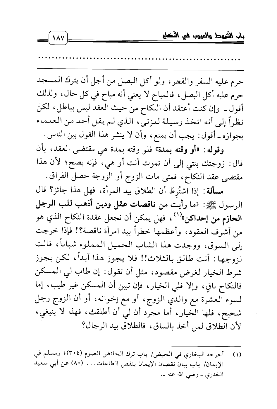 (¬1) أخرجه البخاري في الحيض/ باب ترك الحائض الصوم (304)؛ ومسلم في الإيمان/ باب بيان نقصان الإيمان بنقص الطاعات ... (80) عن أبي سعيد الخدري ـ رضي الله عنه ـ.
