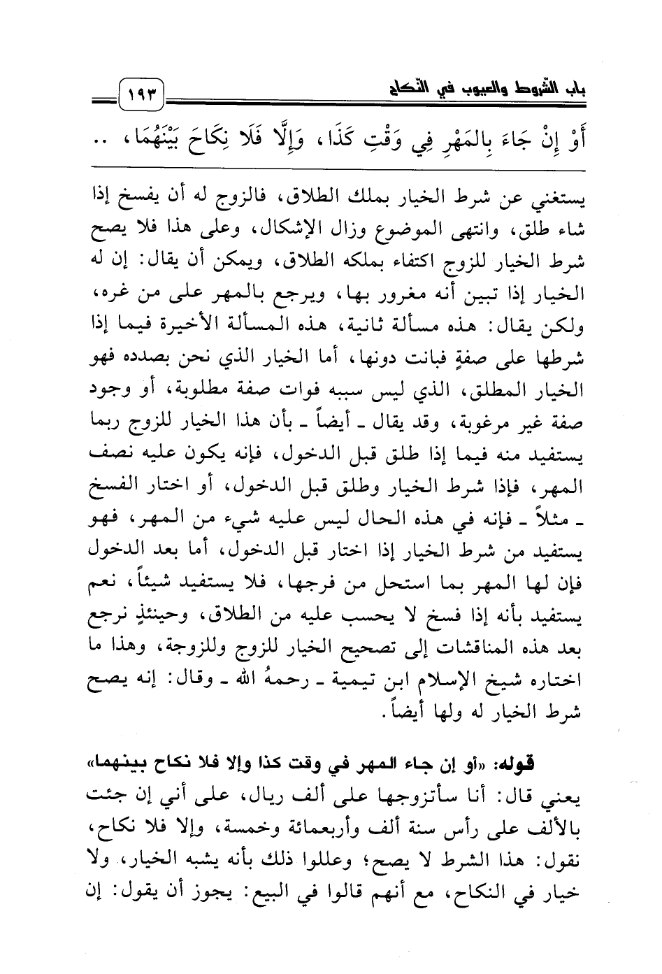 قوله: «أو إن جاء المهر في وقت كذا وإلا فلا نكاح بينهما» يعني قال: أنا سأتزوجها على ألف ريال، على أني إن جئت بالألف على رأس سنة ألف وأربعمائة وخمسة، وإلا فلا نكاح، نقول: هذا الشرط لا يصح؛ وعللوا ذلك بأنه يشبه الخيار، ولا خيار في النكاح، مع أنهم قالوا في البيع: يجوز أن يقول: إن