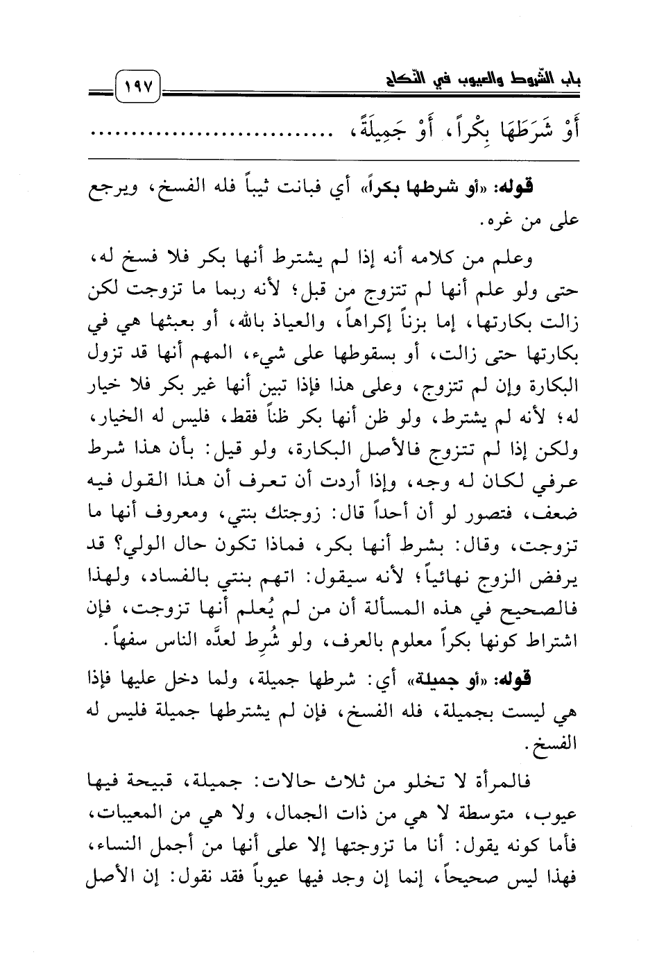 أَوْ شَرَطَهَا بِكْراً، أَوْ جَمِيلَةً، أَوْ نَسِيبَةً، أَوْ نَفْيَ عَيْبٍ لاَ يَنْفَسِخُ بِهِ النِّكَاحُ فَبَانَتْ بِخِلاَفِهِ فَلَهُ الفَسْخُ، .........