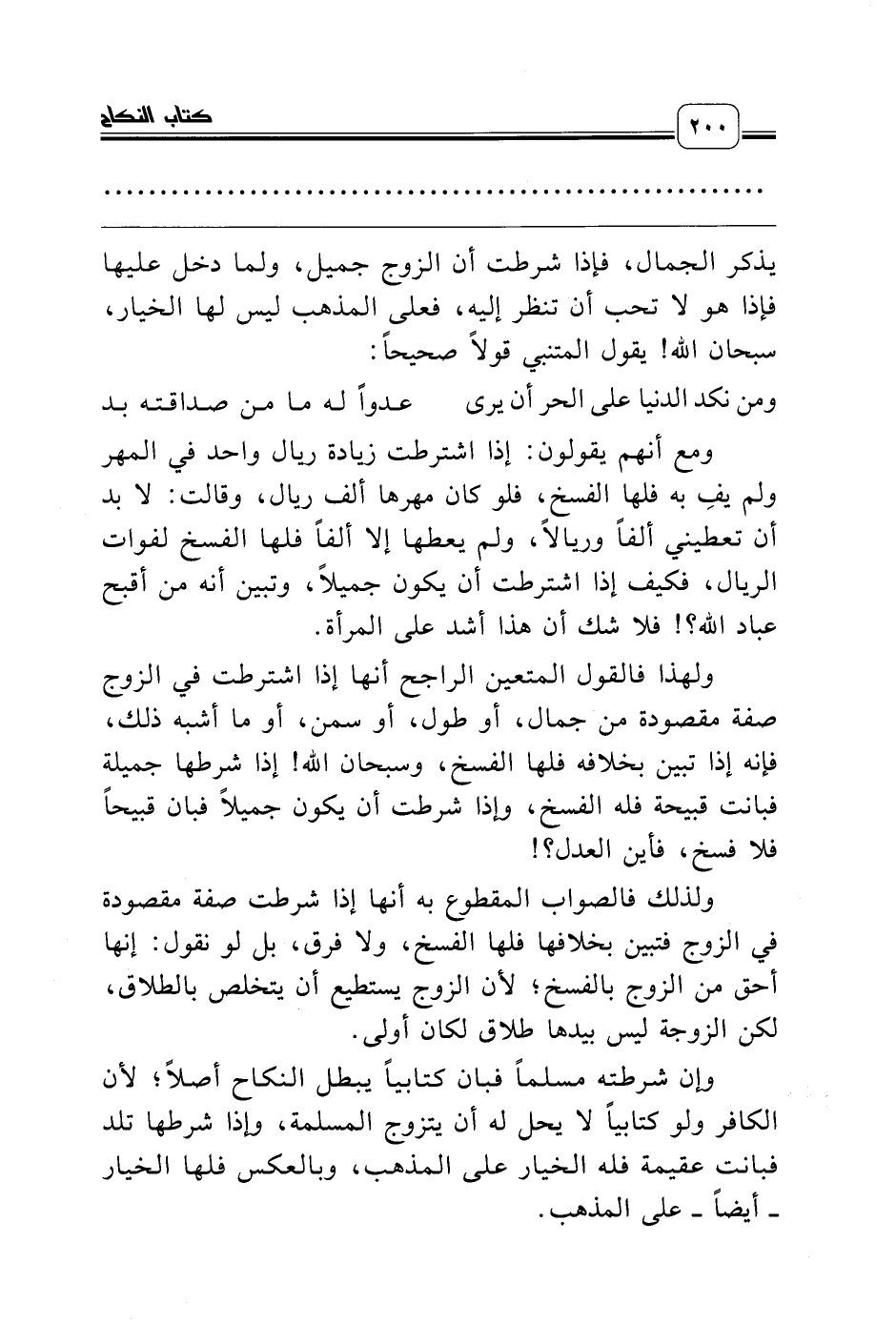 ولهذا فالقول المتعين الراجح أنها إذا اشترطت في الزوج صفة مقصودة من جمال، أو طول، أو سمن، أو ما أشبه ذلك، فإنه إذا تبين بخلافه فلها الفسخ، وسبحان الله! إذا شرطها جميلة فبانت قبيحة فله الفسخ، وإذا شرطت أن يكون جميلاً فبان قبيحاً فلا فسخ، فأين العدل؟!