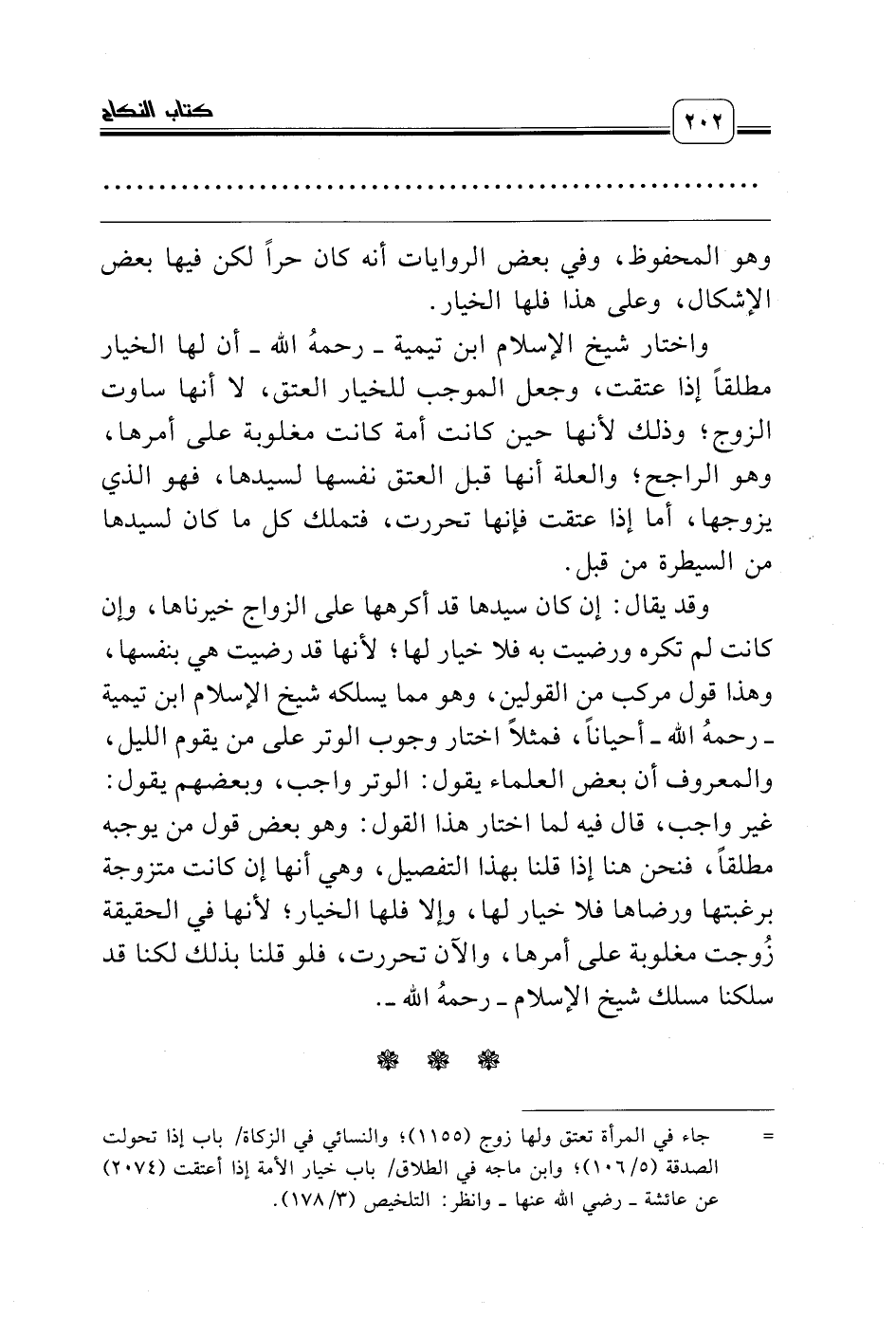 واختار شيخ الإسلام ابن تيمية ـ رحمه الله ـ أن لها الخيار مطلقاً إذا عتقت، وجعل الموجب للخيار العتق، لا أنها ساوت الزوج؛ وذلك لأنها حين كانت أمة كانت مغلوبة على أمرها، وهو الراجح؛ والعلة أنها قبل العتق نفسها لسيدها، فهو الذي يزوجها، أما إذا عتقت فإنها تحررت، فتملك كل ما كان لسيدها من السيطرة من قبل.
