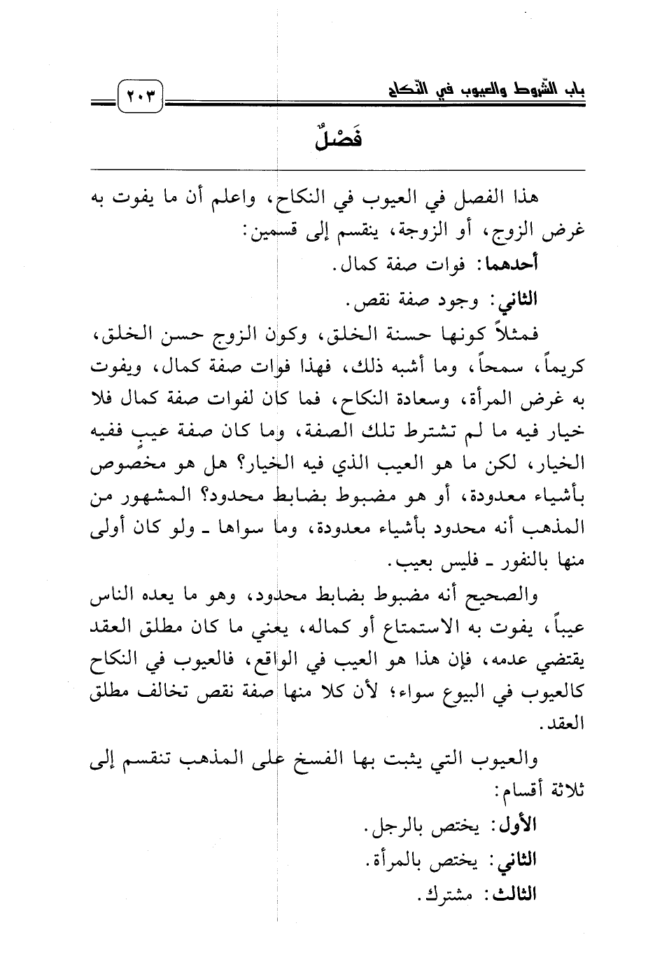فمثلاً كونها حسنة الخلق، وكون الزوج حسن الخلق، كريماً، سمحاً، وما أشبه ذلك، فهذا فوات صفة كمال، ويفوت به غرض المرأة، وسعادة النكاح، فما كان لفوات صفة كمال فلا خيار فيه ما لم تشترط تلك الصفة، وما كان صفة عيبٍ ففيه الخيار، لكن ما هو العيب الذي فيه الخيار؟ هل هو مخصوص بأشياء معدودة، أو هو مضبوط بضابط محدود؟ المشهور من المذهب أنه محدود بأشياء معدودة، وما سواها ـ ولو كان أولى منها بالنفور ـ فليس بعيب.