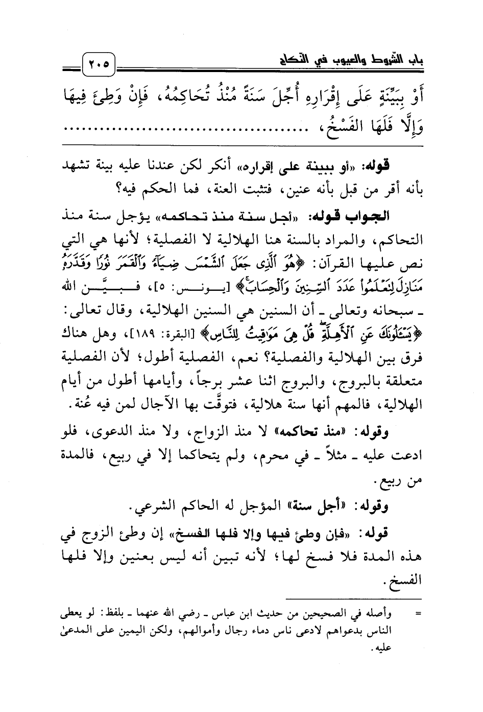 الجواب قوله: «أجل سنة منذ تحاكمه» يؤجل سنة منذ التحاكم، والمراد بالسنة هنا الهلالية لا الفصلية؛ لأنها هي التي نص عليها القرآن: {هُوَ الَّذِي جَعَلَ الشَّمْسَ ضِيَاءً وَالْقَمَرَ نُورًا وَقَدَّرَهُ مَنَازِلَ} {لِتَعْلَمُوا عَدَدَ السِّنِينَ وَالْحِسَابَ} [يونس: 5]، فبيَّن الله ـ سبحانه وتعالى ـ أن السنين هي السنين الهلالية، وقال تعالى: {يَسْأَلُونَكَ عَنِ الأَهِلَّةِ قُلْ هِيَ مَوَاقِيتُ لِلنَّاسِ} [البقرة: 189]، وهل هناك فرق بين الهلالية والفصلية؟ نعم، الفصلية أطول؛ لأن الفصلية متعلقة بالبروج، والبروج اثنا عشر برجاً، وأيامها أطول من أيام الهلالية، فالمهم أنها سنة هلالية، فتوقَّت بها الآجال لمن فيه عُنة.