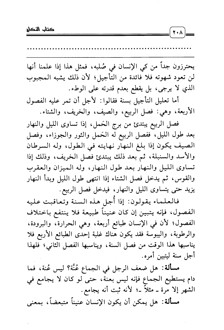 فالعلماء يقولون: إذا أُجل هذه السنة وتعاقبت عليه الفصول، فإنه يتبين إن كان عنيناً طبيعة فلا ينتفع باختلاف الفصول؛ لأن في الإنسان طبائع أربعة، وهي الحرارة، والبرودة، والرطوبة، واليبوسة فقد يكون هناك غلبة إحدى الطبائع الأربع فلا يناسبها هذا الوقت من فصل السنة، ويناسبها الفصل الثاني؛ فلهذا أجل سنة ليتبين أمره.