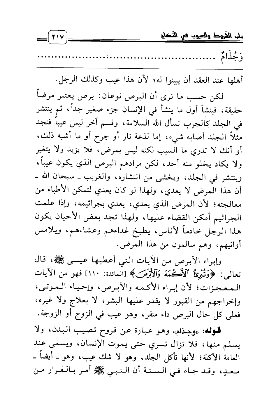 قوله: «وجذام» وهو عبارة عن قروح تصيب البدن، ولا يسلم منها، فلا تزال تسري حتى يموت الإنسان، ويسمى عند العامة الآكلة؛ لأنها تأكل الجلد، وهو لا شك عيب، وهو ـ أيضاً ـ معدٍ، وقد جاء في السنة أن النبي صلّى الله عليه وسلّم أمر بالفرار من