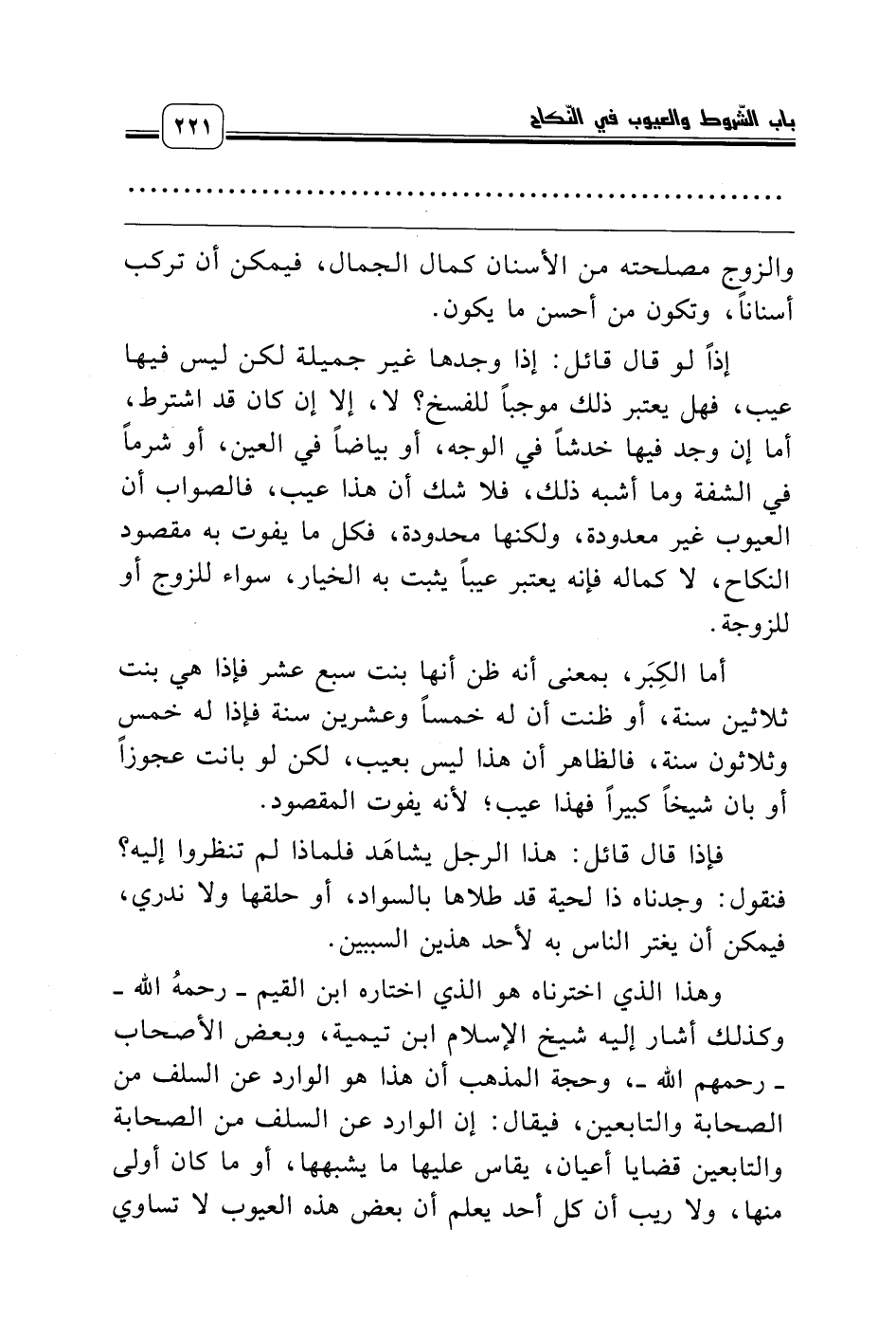 وهذا الذي اخترناه هو الذي اختاره ابن القيم ـ رحمه الله ـ وكذلك أشار إليه شيخ الإسلام ابن تيمية، وبعض الأصحاب ـ رحمهم الله ـ، وحجة المذهب أن هذا هو الوارد عن السلف من الصحابة والتابعين، فيقال: إن الوارد عن السلف من الصحابة والتابعين قضايا أعيان، يقاس عليها ما يشبهها، أو ما كان أولى منها، ولا ريب أن كل أحد يعلم أن بعض هذه العيوب لا تساوي