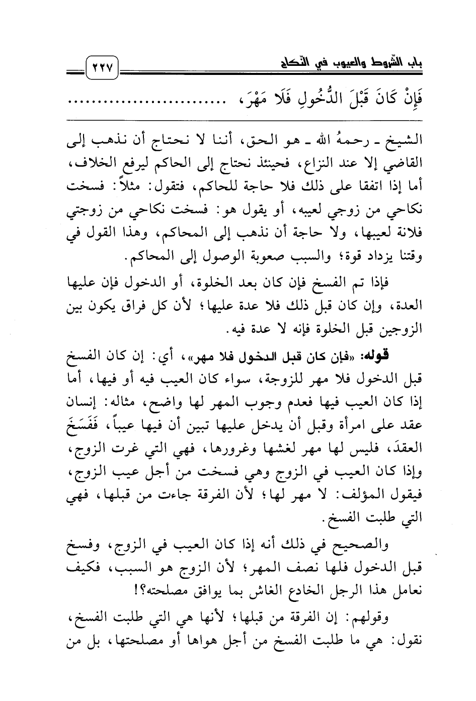قوله: «فإن كان قبل الدخول فلا مهر»، أي: إن كان الفسخ قبل الدخول فلا مهر للزوجة، سواء كان العيب فيه أو فيها، أما إذا كان العيب فيها فعدم وجوب المهر لها واضح، مثاله: إنسان عقد على امرأة وقبل أن يدخل عليها تبين أن فيها عيباً، فَفَسَخَ العقدَ، فليس لها مهر لغشها وغرورها، فهي التي غرت الزوج، وإذا كان العيب في الزوج وهي فسخت من أجل عيب الزوج، فيقول المؤلف: لا مهر لها؛ لأن الفرقة جاءت من قبلها، فهي التي طلبت الفسخ.