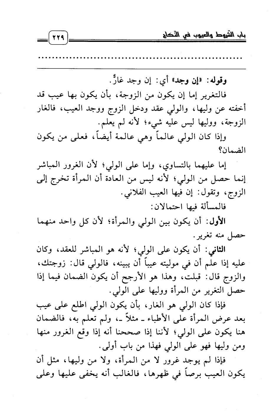 الثاني: أن يكون على الولي؛ لأنه هو المباشر للعقد، وكان عليه إذا علم أن في موليته عيباً أن يبينه، فالولي قال: زوجتك، والزوج قال: قبلت، وهذا هو الأرجح أن يكون الضمان فيما إذا حصل التغرير من المرأة ووليها على الولي.