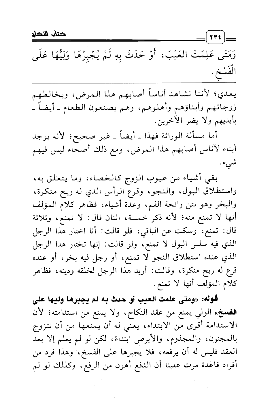 بقي أشياء من عيوب الزوج كالخصاء، وما يتعلق به، واستطلاق البول، والنجو، وقرع الرأس الذي له ريح منكرة، والبخر وهو نتن رائحة الفم، وعدة أشياء، فظاهر كلام المؤلف أنها لا تمنع منه؛ لأنه ذكر خمسة، اثنان قال: لا تمنع، وثلاثة قال: تمنع، وسكت عن الباقي، فلو قالت: أنا اختار هذا الرجل الذي فيه سلس البول لا تمنع، ولو قالت: إنها تختار هذا الرجل الذي عنده استطلاق النجو لا تمنع، أو رجل فيه بخر، أو عنده قرع له ريح منكرة، وقالت: أريد هذا الرجل لخلقه ودينه، فظاهر كلام المؤلف أنها لا تمنع.