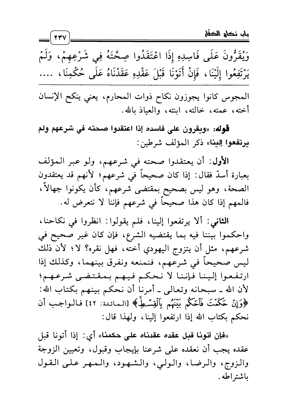 الثاني: ألا يرتفعوا إلينا، فلم يقولوا: انظروا في نكاحنا، واحكموا بيننا فيه بما يقتضيه الشرع، فإن كان غير صحيح في شرعهم، مثل أن يتزوج اليهودي أخته، فهل نقره؟ لا؛ لأن ذلك ليس صحيحاً في شرعهم، فنمنعه ونفرق بينهما، وكذلك إذا ارتفعوا إلينا فإننا لا نحكم فيهم بمقتضى شرعهم؛ لأن الله ـ سبحانه وتعالى ـ أمرنا أن نحكم بينهم بكتاب الله: {وَإِنْ حَكَمْتَ فَاحْكُمْ بَيْنَهُمْ بِالْقِسْطِ} [المائدة: 42] فالواجب أن نحكم بكتاب الله إذا ارتفعوا إلينا، ولهذا قال: