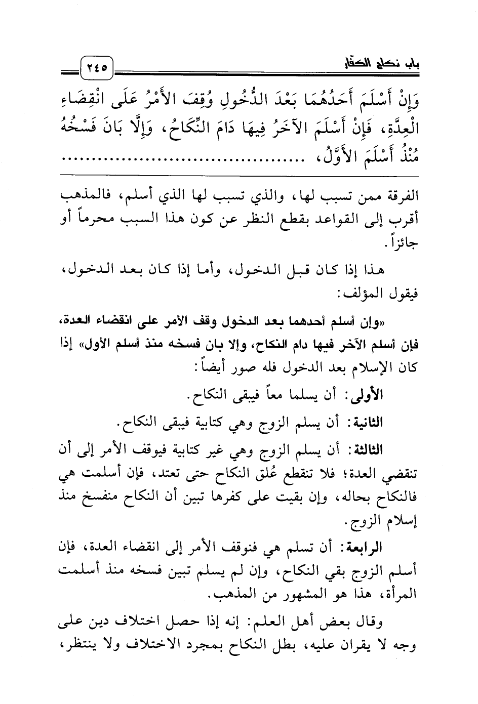 «وإن أسلم أحدهما بعد الدخول وقف الأمر على انقضاء العدة، فإن أسلم الآخر فيها دام النكاح، وإلا بان فسخه منذ أسلم الأول» إذا كان الإسلام بعد الدخول فله صور أيضاً: