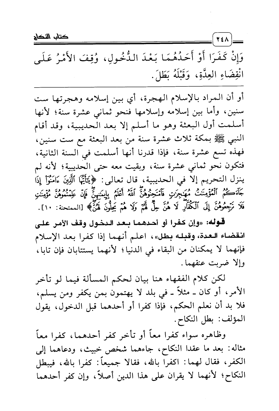 قوله: «وإن كفرا أو أحدهما بعد الدخول وقف الأمر على انقضاء العدة، وقبله بطل»، اعلم أنهما إذا كفرا بعد الإسلام فإنهما لا يمكنان من البقاء في الدنيا؛ لأنهما يستتابان فإن تابا، وإلا ضربت عنقهما.