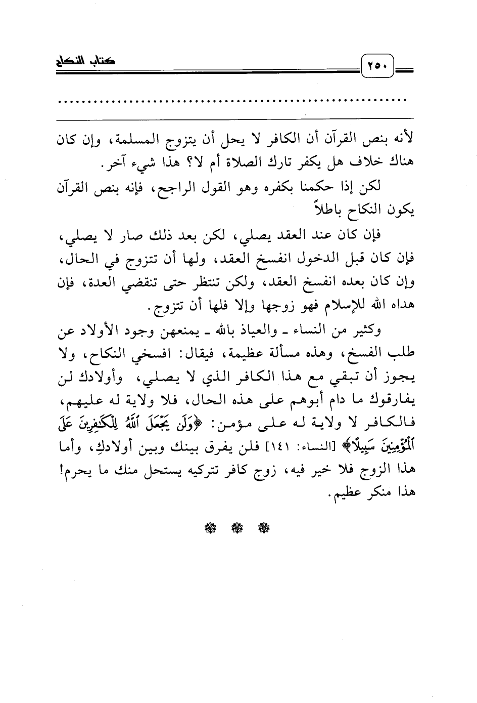 وكثير من النساء ـ والعياذ بالله ـ يمنعهن وجود الأولاد عن طلب الفسخ، وهذه مسألة عظيمة، فيقال: افسخي النكاح، ولا يجوز أن تبقي مع هذا الكافر الذي لا يصلي، وأولادك لن يفارقوك ما دام أبوهم على هذه الحال، فلا ولاية له عليهم، فالكافر لا ولاية له على مؤمن: {وَلَنْ يَجْعَلَ اللَّهُ لِلْكَافِرِينَ عَلَى الْمُؤْمِنِينَ سَبِيلاً} [النساء: 141] فلن يفرق بينك وبين أولادكِ، وأما هذا الزوج فلا خير فيه، زوج كافر تتركيه يستحل منك ما يحرم! هذا منكر عظيم.