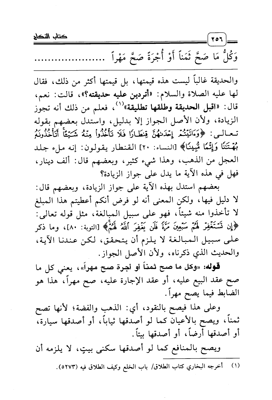 والحديقة غالباً ليست هذه قيمتها، بل قيمتها أكثر من ذلك، فقال لها عليه الصلاة والسلام: «أتردين عليه حديقته؟»، قالت: نعم، قال: «اقبل الحديقة وطلقها تطليقة» (¬1)، فعلم من ذلك أنه تجوز الزيادة، ولأن الأصل الجواز إلا بدليل، واستدل بعضهم بقوله تعالى: {وَآتَيْتُمْ إِحْدَاهُنَّ قِنْطَارًا فَلاَ تَأْخُذُوا مِنْهُ شَيْئًا أَتَأْخُذُونَهُ بُهْتَاناً وَإِثْمًا مُبِيناً} [النساء: 20] القنطار يقولون: إنه ملء جلد العجل من الذهب، وهذا شيء كثير، وبعضهم قال: ألف دينار، فهل في هذه الآية ما يدل على جواز الزيادة؟