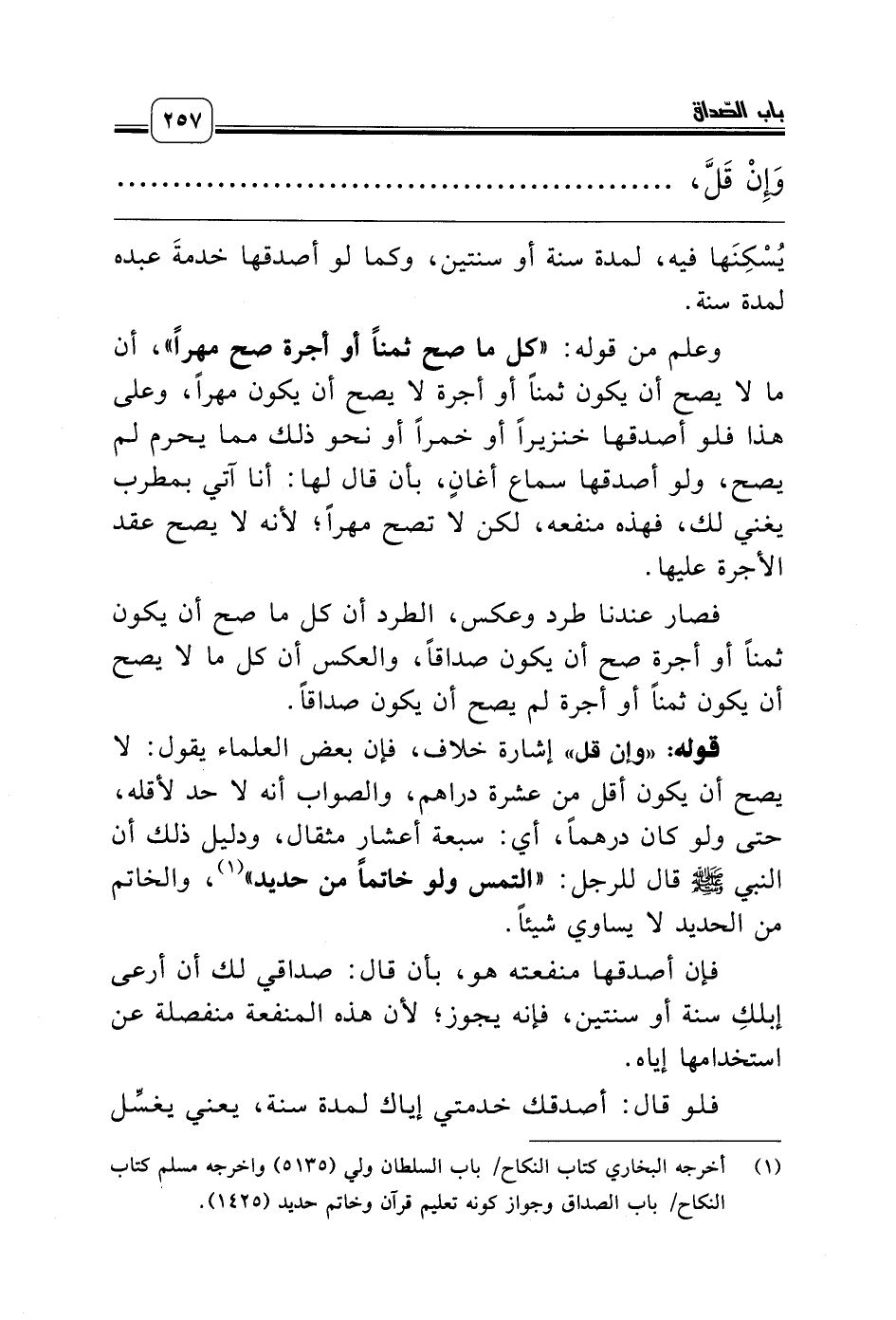 قوله: «وإن قل» إشارة خلاف، فإن بعض العلماء يقول: لا يصح أن يكون أقل من عشرة دراهم، والصواب أنه لا حد لأقله، حتى ولو كان درهماً، أي: سبعة أعشار مثقال، ودليل ذلك أن النبي صلّى الله عليه وسلّم قال للرجل: «التمس ولو خاتماً من حديد» (¬1)، والخاتم من الحديد لا يساوي شيئاً.