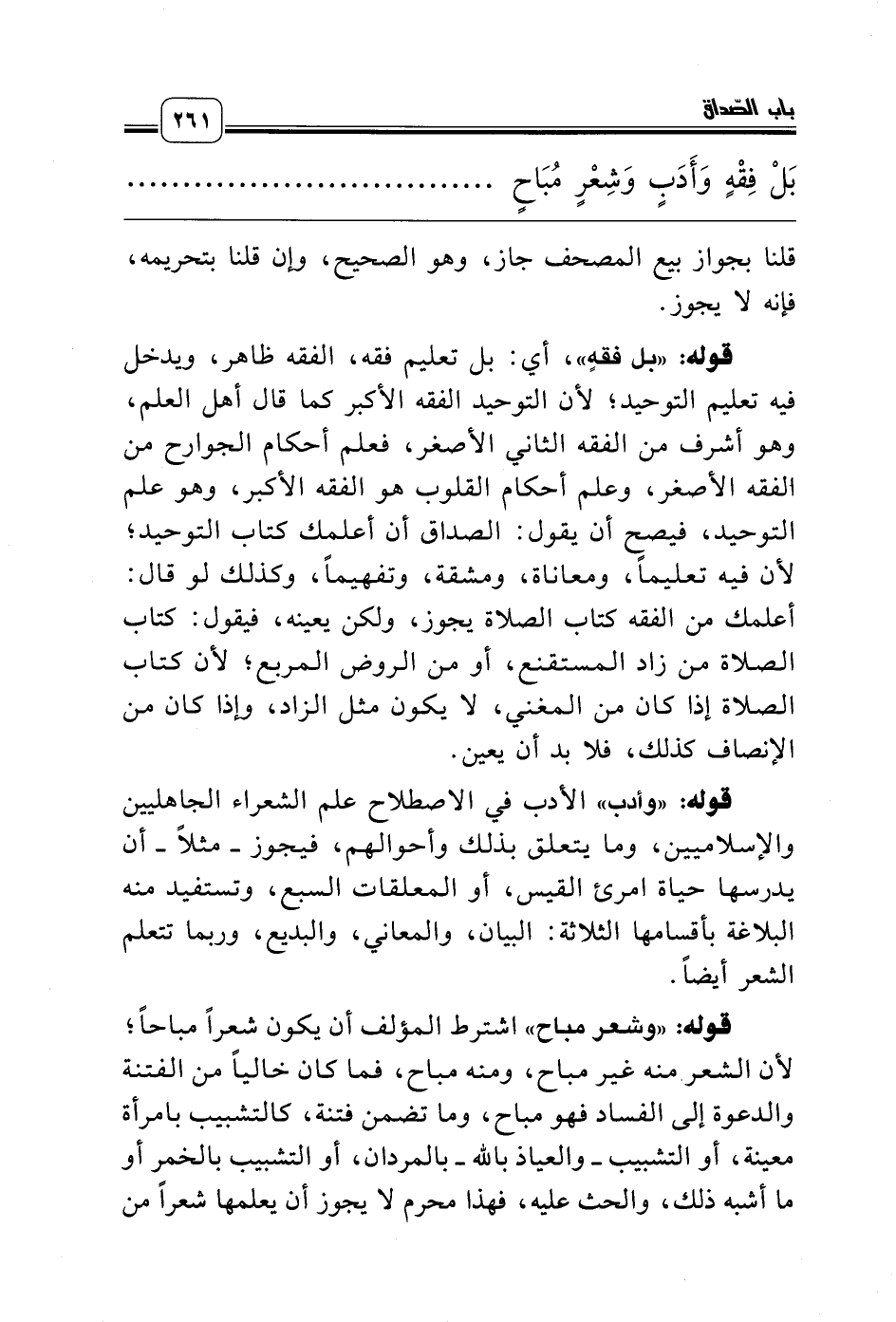 قوله: «بل فقهٍ»، أي: بل تعليم فقه، الفقه ظاهر، ويدخل فيه تعليم التوحيد؛ لأن التوحيد الفقه الأكبر كما قال أهل العلم، وهو أشرف من الفقه الثاني الأصغر، فعلم أحكام الجوارح من الفقه الأصغر، وعلم أحكام القلوب هو الفقه الأكبر، وهو علم التوحيد، فيصح أن يقول: الصداق أن أعلمك كتاب التوحيد؛ لأن فيه تعليماً، ومعاناة، ومشقة، وتفهيماً، وكذلك لو قال: أعلمك من الفقه كتاب الصلاة يجوز، ولكن يعينه، فيقول: كتاب الصلاة من زاد المستقنع، أو من الروض المربع؛ لأن كتاب الصلاة إذا كان من المغني، لا يكون مثل الزاد، وإذا كان من الإنصاف كذلك، فلا بد أن يعين.