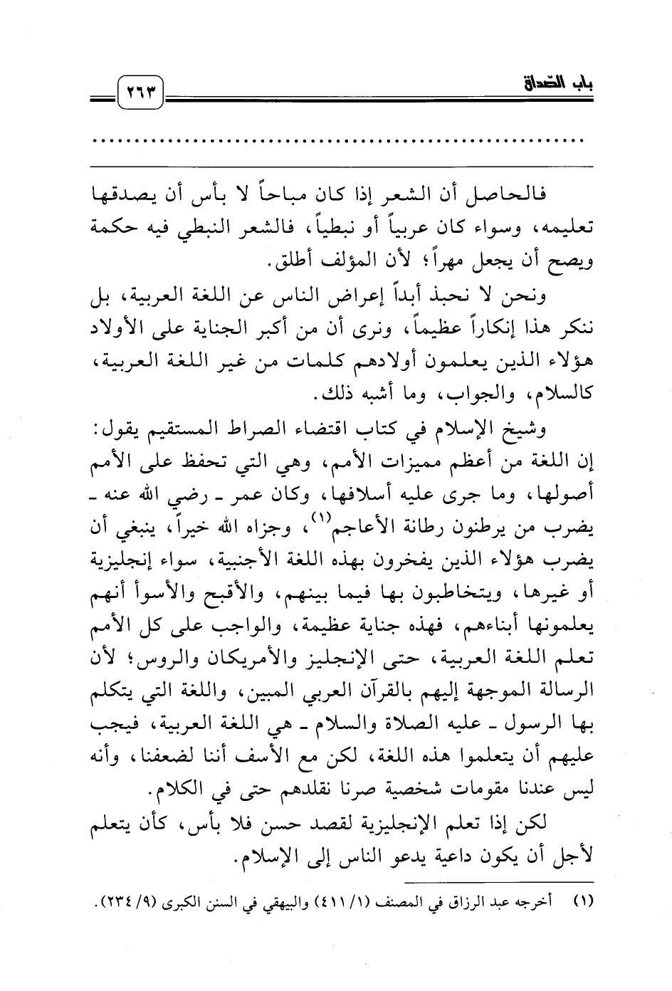 ونحن لا نحبذ أبداً إعراض الناس عن اللغة العربية، بل ننكر هذا إنكاراً عظيماً، ونرى أن من أكبر الجناية على الأولاد هؤلاء الذين يعلمون أولادهم كلمات من غير اللغة العربية، كالسلام، والجواب، وما أشبه ذلك.