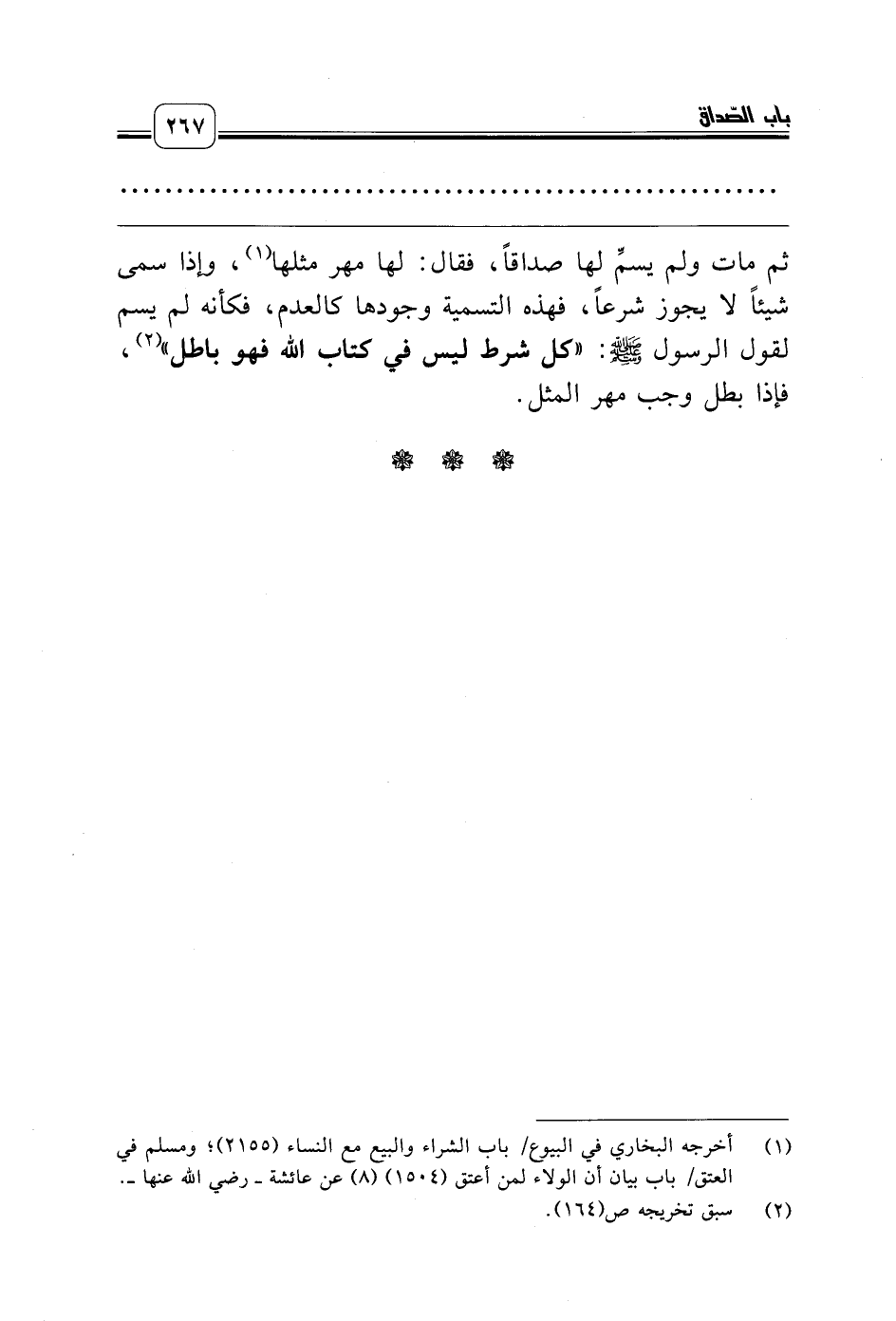 ثم مات ولم يسمِّ لها صداقاً، فقال: لها مهر مثلها (¬1)، وإذا سمى شيئاً لا يجوز شرعاً، فهذه التسمية وجودها كالعدم، فكأنه لم يسم لقول الرسول صلّى الله عليه وسلّم: «كل شرط ليس في كتاب الله فهو باطل» (¬2)، فإذا بطل وجب مهر المثل.