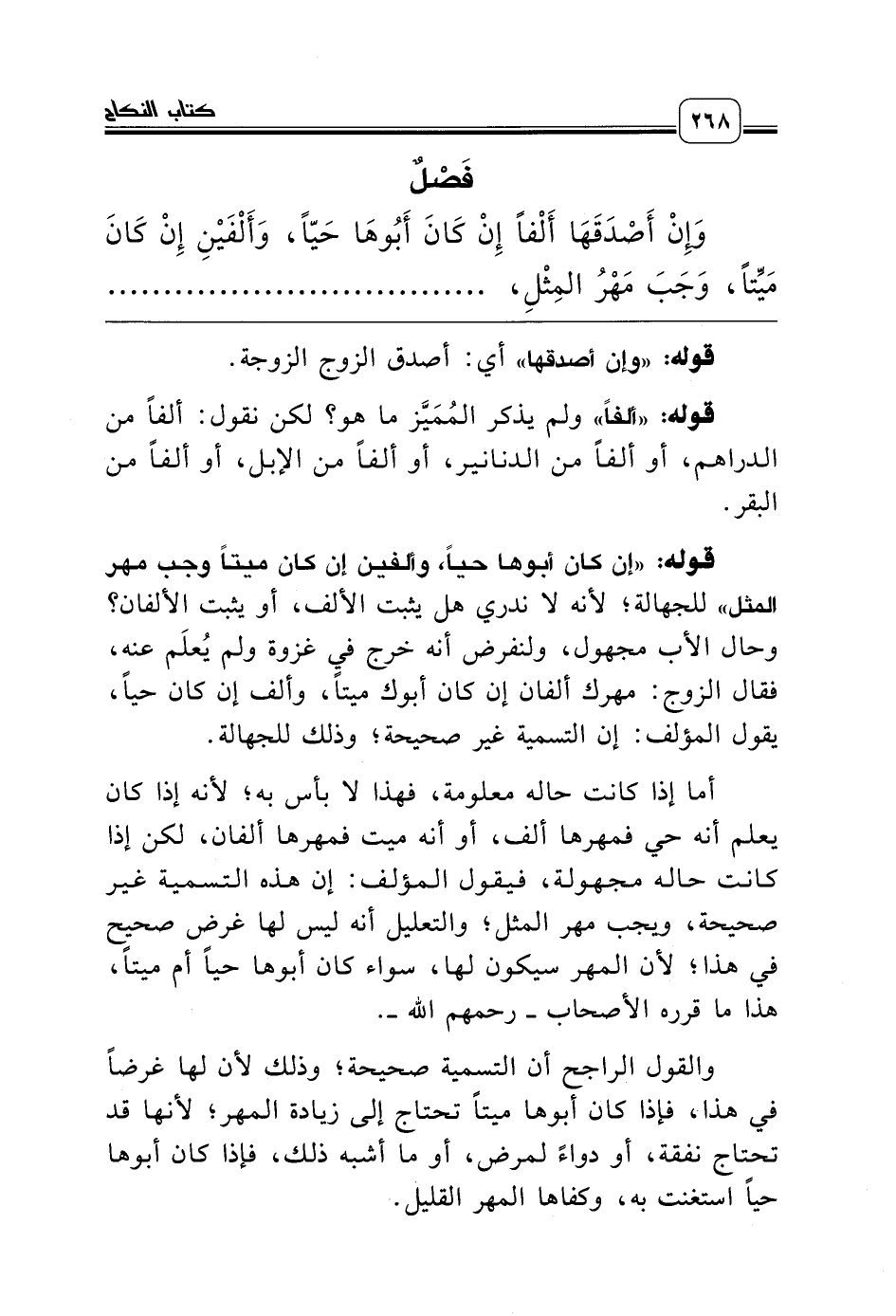 قوله: «إن كان أبوها حياً، وألفين إن كان ميتاً وجب مهر المثل» للجهالة؛ لأنه لا ندري هل يثبت الألف، أو يثبت الألفان؟ وحال الأب مجهول، ولنفرض أنه خرج في غزوة ولم يُعلَم عنه، فقال الزوج: مهرك ألفان إن كان أبوك ميتاً، وألف إن كان حياً، يقول المؤلف: إن التسمية غير صحيحة؛ وذلك للجهالة.