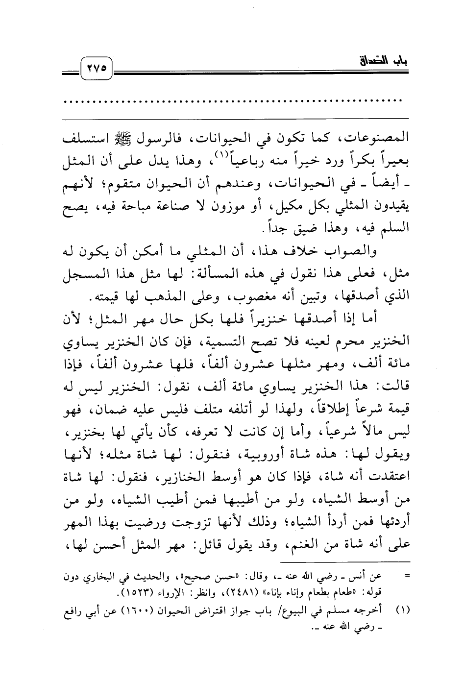 المصنوعات، كما تكون في الحيوانات، فالرسول صلّى الله عليه وسلّم استسلف بعيراً بكراً ورد خيراً منه رباعياً (¬1)، وهذا يدل على أن المثل ـ أيضاً ـ في الحيوانات، وعندهم أن الحيوان متقوم؛ لأنهم يقيدون المثلي بكل مكيل، أو موزون لا صناعة مباحة فيه، يصح السلم فيه، وهذا ضيق جداً.