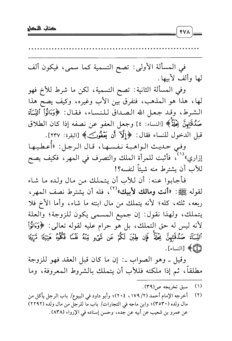 وفي المسألة الثانية: تصح التسمية، لكن ما شرط للأخ فهو لها، هذا هو المذهب، فنفرق بين الأب وغيره، وكيف يصح هذا الشرط، وقد جعل الله الصداق للنساء، فقال: {وَآتُوا النِّسَاءَ صَدُقَاتِهِنَّ نِحْلَةً} [النساء: 4] وجعل العفو عن نصفه إذا كان الطلاق قبل الدخول للنساء فقال: {إِلاَّ أَنْ يَعْفُونَ} [البقرة: 237].