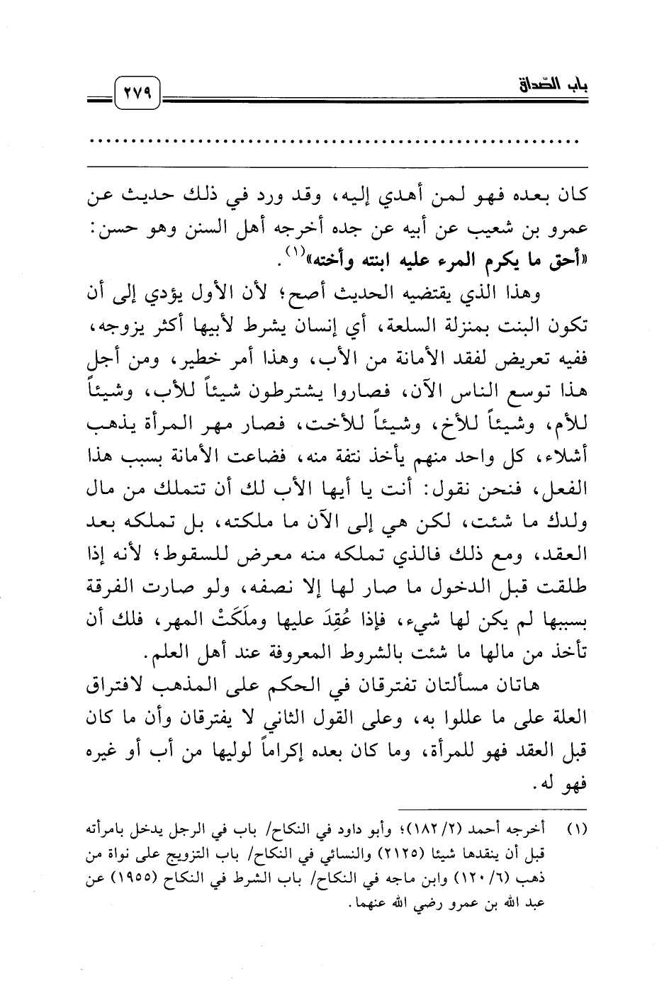 وهذا الذي يقتضيه الحديث أصح؛ لأن الأول يؤدي إلى أن تكون البنت بمنزلة السلعة، أي إنسان يشرط لأبيها أكثر يزوجه، ففيه تعريض لفقد الأمانة من الأب، وهذا أمر خطير، ومن أجل هذا توسع الناس الآن، فصاروا يشترطون شيئاً للأب، وشيئاً للأم، وشيئاً للأخ، وشيئاً للأخت، فصار مهر المرأة يذهب أشلاء، كل واحد منهم يأخذ نتفة منه، فضاعت الأمانة بسبب هذا الفعل، فنحن نقول: أنت يا أيها الأب لك أن تتملك من مال ولدك ما شئت، لكن هي إلى الآن ما ملكته، بل تملكه بعد العقد، ومع ذلك فالذي تملكه منه معرض للسقوط؛ لأنه إذا طلقت قبل الدخول ما صار لها إلا نصفه، ولو صارت الفرقة بسببها لم يكن لها شيء، فإذا عُقِدَ عليها وملَكَتْ المهر، فلك أن تأخذ من مالها ما شئت بالشروط المعروفة عند أهل العلم.