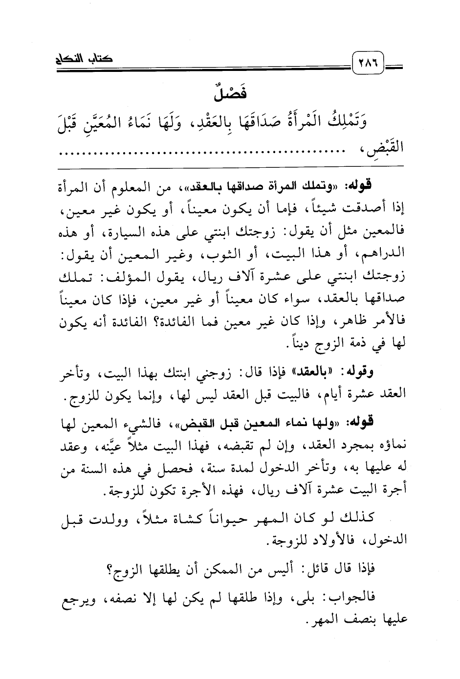 قوله: «وتملك المرأة صداقها بالعقد»، من المعلوم أن المرأة إذا أصدقت شيئاً، فإما أن يكون معيناً، أو يكون غير معين، فالمعين مثل أن يقول: زوجتك ابنتي على هذه السيارة، أو هذه الدراهم، أو هذا البيت، أو الثوب، وغير المعين أن يقول: زوجتك ابنتي على عشرة آلاف ريال، يقول المؤلف: تملك صداقها بالعقد، سواء كان معيناً أو غير معين، فإذا كان معيناً فالأمر ظاهر، وإذا كان غير معين فما الفائدة؟ الفائدة أنه يكون لها في ذمة الزوج ديناً.