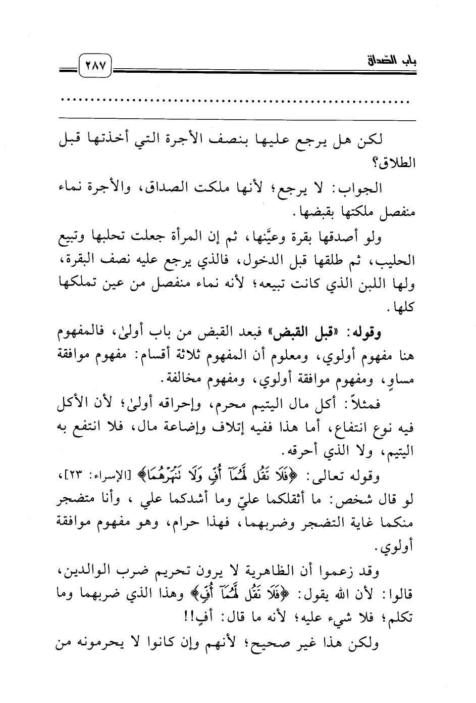 وقوله تعالى: {فَلاَ تَقُلْ لَهُمَا أُفٍّ وَلاَ تَنْهَرْهُمَا} [الإسراء: 23]، لو قال شخص: ما أثقلكما عليّ وما أشدكما علي، وأنا متضجر منكما غاية التضجر وضربهما، فهذا حرام، وهو مفهوم موافقة أولوي.