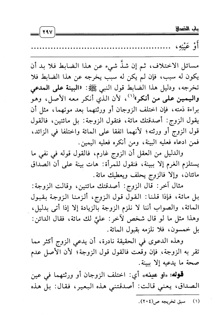 مسائل الاختلاف، ثم إن شذَّ شيء عن هذا الضابط فلا بد أن يكون له سبب، فإن لم يكن له سبب يخرجه عن هذا الضابط فلا تخرجه، ودليل هذا الضابط قول النبي صلّى الله عليه وسلّم: «البينة على المدعي واليمين على من أنكر» (¬1)، لأن الذي أنكر معه الأصل، وهو براءة ذمته، فإن اختلف الزوجان أو ورثتهما بعد موتهما، مثل أن يقول الزوج: أصدقتك مائة، فتقول الزوجة: بل مائتين، فالقول قول الزوج أو ورثته؛ لأنهما اتفقا على المائة واختلفا في الزائد، فمن ادعاه فعليه البينة، ومن أنكره فعليه اليمين.
