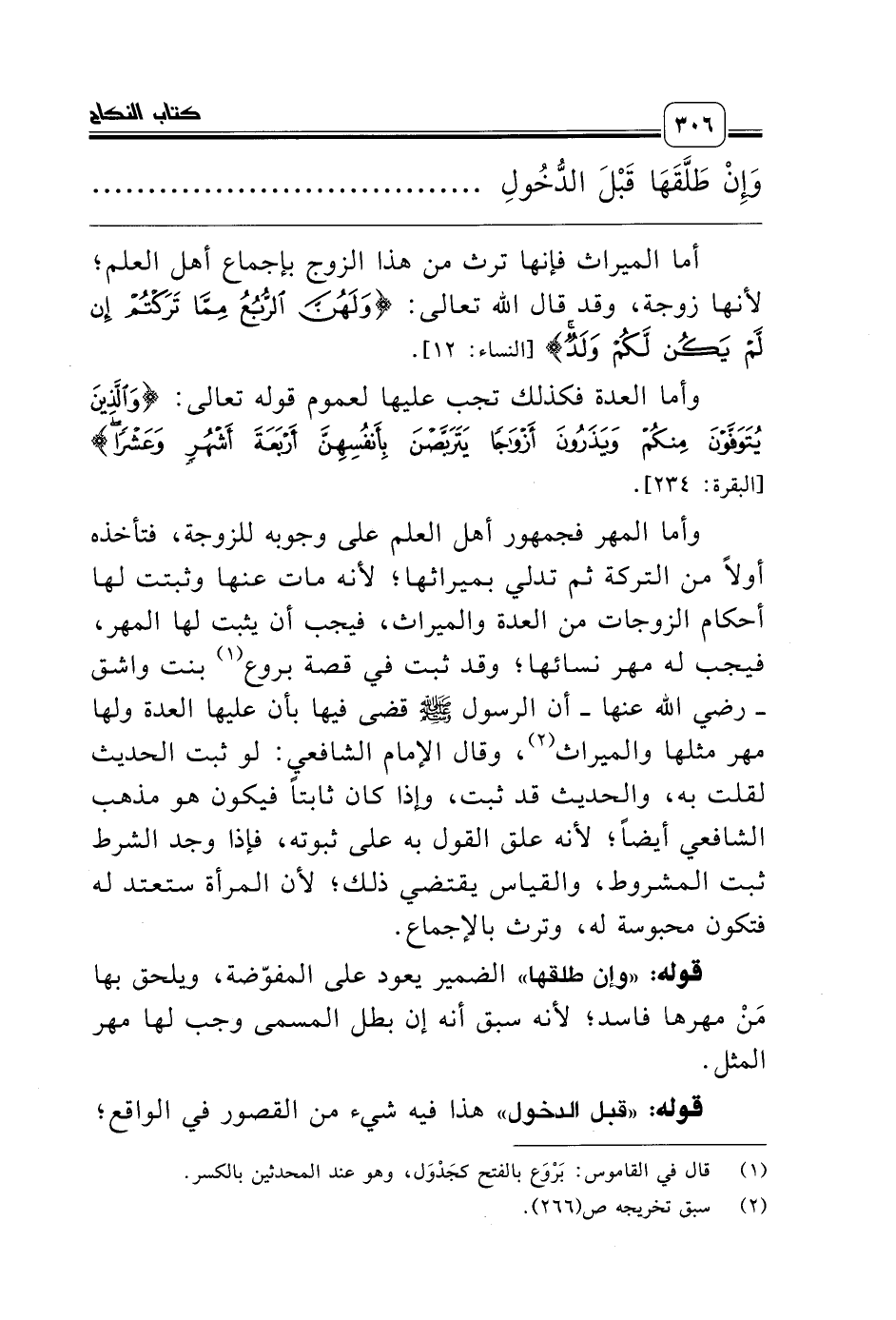 وأما المهر فجمهور أهل العلم على وجوبه للزوجة، فتأخذه أولاً من التركة ثم تدلي بميراثها؛ لأنه مات عنها وثبتت لها أحكام الزوجات من العدة والميراث، فيجب أن يثبت لها المهر، فيجب له مهر نسائها؛ وقد ثبت في قصة بروع (¬1) بنت واشق ـ رضي الله عنها ـ أن الرسول صلّى الله عليه وسلّم قضى فيها بأن عليها العدة ولها مهر مثلها والميراث (¬2)، وقال الإمام الشافعي: لو ثبت الحديث لقلت به، والحديث قد ثبت، وإذا كان ثابتاً فيكون هو مذهب الشافعي أيضاً؛ لأنه علق القول به على ثبوته، فإذا وجد الشرط ثبت المشروط، والقياس يقتضي ذلك؛ لأن المرأة ستعتد له فتكون محبوسة له، وترث بالإجماع.