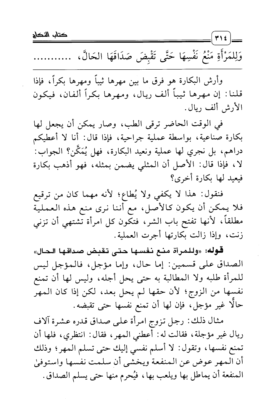 في الوقت الحاضر ترقى الطب، وصار يمكن أن يجعل لها بكارة صناعية، بواسطة عملية جراحية، فإذا قال: أنا لا أعطيكم دراهم، بل نجري لها عملية ونعيد البكارة، فهل يُمَكَّن؟ الجواب: لا، فإذا قال: الأصل أن المثلي يضمن بمثله، فهو أذهب بكارة فيعيد لها بكارة أخرى؟