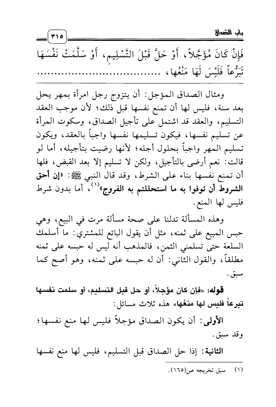 ومثال الصداق المؤجل: أن يتزوج رجل امرأة بمهر يحل بعد سنة، فليس لها أن تمنع نفسها قبل ذلك؛ لأن موجب العقد التسليم، والعقد قد اشتمل على تأجيل الصداق، وسكوت المرأة عن تسليم نفسها، فيكون تسليمها نفسها واجباً بالعقد، ويكون تسليم المهر واجباً بحلول أجله؛ لأنها رضيت بتأجيله، أما لو قالت: نعم أرضى بالتأجيل، ولكن لا تسليم إلا بعد القبض، فلها أن تمنع نفسها بناء على الشرط، وقد قال النبي صلّى الله عليه وسلّم: «إن أحق الشروط أن توفوا به ما استحللتم به الفروج» (¬1)، أما بدون شرط فليس لها المنع.