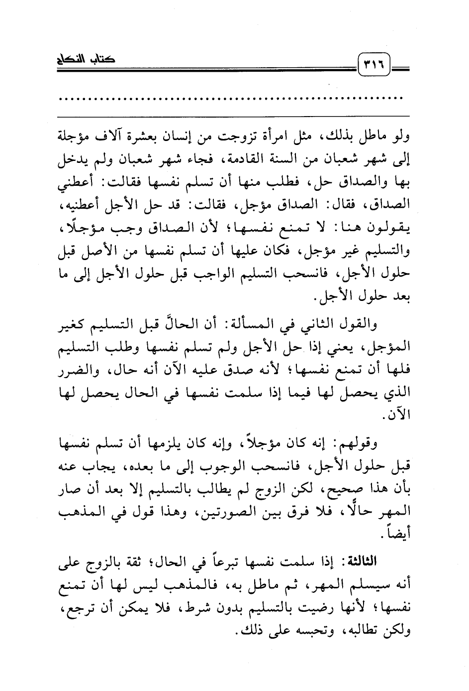 ولو ماطل بذلك، مثل امرأة تزوجت من إنسان بعشرة آلاف مؤجلة إلى شهر شعبان من السنة القادمة، فجاء شهر شعبان ولم يدخل بها والصداق حل، فطلب منها أن تسلم نفسها فقالت: أعطني الصداق، فقال: الصداق مؤجل، فقالت: قد حل الأجل أعطنيه، يقولون هنا: لا تمنع نفسها؛ لأن الصداق وجب مؤجلاً، والتسليم غير مؤجل، فكان عليها أن تسلم نفسها من الأصل قبل حلول الأجل، فانسحب التسليم الواجب قبل حلول الأجل إلى ما بعد حلول الأجل.