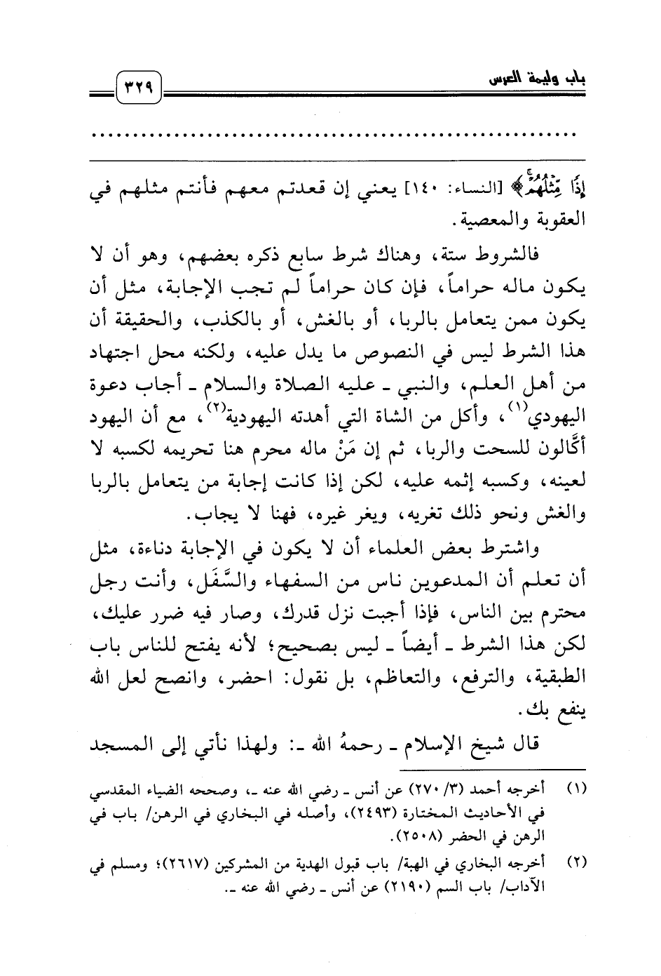 واشترط بعض العلماء أن لا يكون في الإجابة دناءة، مثل أن تعلم أن المدعوين ناس من السفهاء والسَّفَل، وأنت رجل محترم بين الناس، فإذا أجبت نزل قدرك، وصار فيه ضرر عليك، لكن هذا الشرط ـ أيضاً ـ ليس بصحيح؛ لأنه يفتح للناس باب الطبقية، والترفع، والتعاظم، بل نقول: احضر، وانصح لعل الله ينفع بك.