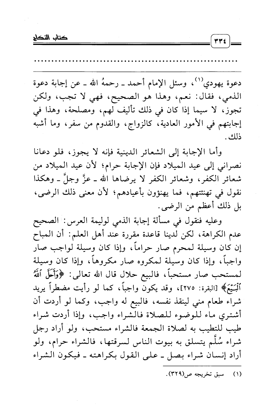 دعوة يهودي (¬1)، وسئل الإمام أحمد ـ رحمه الله ـ عن إجابة دعوة الذمي، فقال: نعم، وهذا هو الصحيح، فهي لا تجب، ولكن تجوز، لا سيما إذا كان في ذلك تأليف لهم، ومصلحة، وهذا في إجابتهم في الأمور العادية، كالزواج، والقدوم من سفر، وما أشبه ذلك.