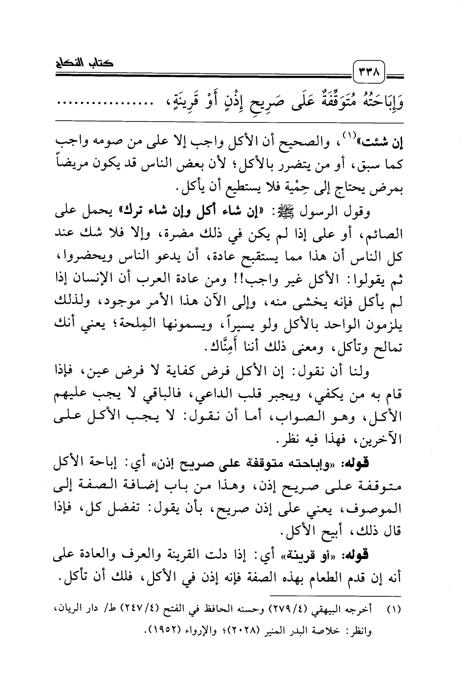 وقول الرسول صلّى الله عليه وسلّم: «إن شاء أكل وإن شاء ترك» يحمل على الصائم، أو على إذا لم يكن في ذلك مضرة، وإلا فلا شك عند كل الناس أن هذا مما يستقبح عادة، أن يدعو الناس ويحضروا، ثم يقولوا: الأكل غير واجب!! ومن عادة العرب أن الإنسان إذا لم يأكل فإنه يخشى منه، وإلى الآن هذا الأمر موجود، ولذلك يلزمون الواحد بالأكل ولو يسيراً، ويسمونها المِلحة؛ يعني أنك تمالح وتأكل، ومعنى ذلك أننا أَمِنَّاك.