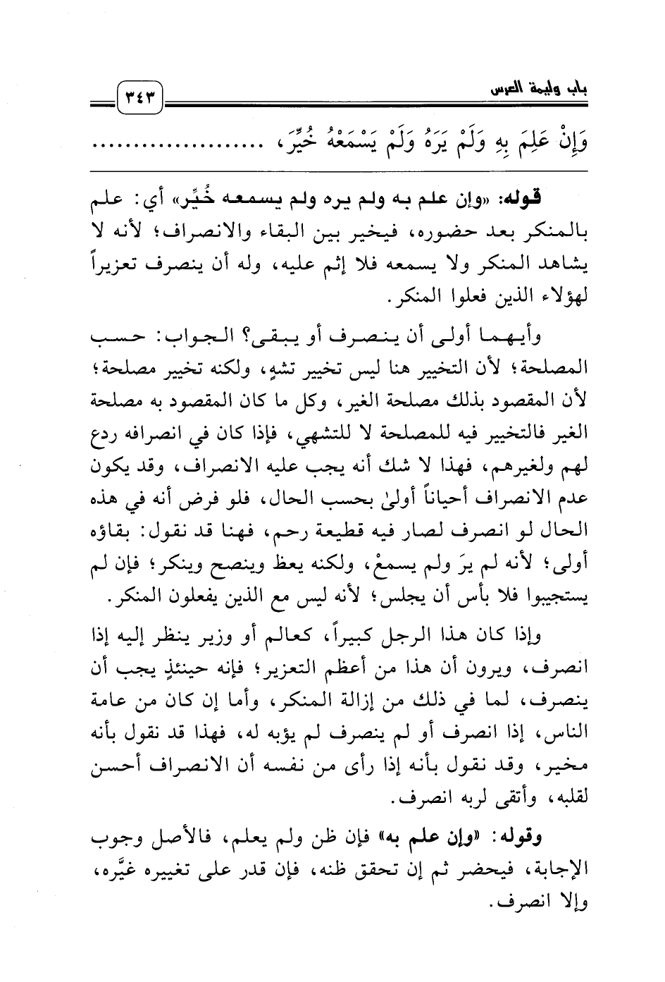 قوله: «وإن علم به ولم يره ولم يسمعه خُيِّر» أي: علم بالمنكر بعد حضوره، فيخير بين البقاء والانصراف؛ لأنه لا يشاهد المنكر ولا يسمعه فلا إثم عليه، وله أن ينصرف تعزيراً لهؤلاء الذين فعلوا المنكر.