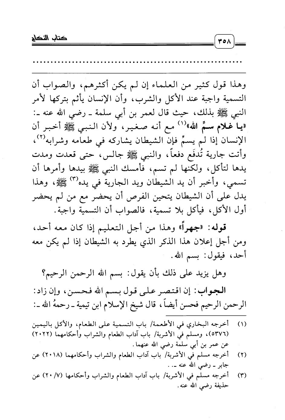وهذا قول كثير من العلماء إن لم يكن أكثرهم، والصواب أن التسمية واجبة عند الأكل والشرب، وأن الإنسان يأثم بتركها لأمر النبي صلّى الله عليه وسلّم بذلك، حيث قال لعمر بن أبي سلمة ـ رضي الله عنه ـ: «يا غلام سمِّ الله» (¬1) مع أنه صغير، ولأن النبي صلّى الله عليه وسلّم أخبر أن الإنسان إذا لم يسمِّ فإن الشيطان يشاركه في طعامه وشرابه (¬2)، وأتت جارية تُدفَع دفعاً، والنبي صلّى الله عليه وسلّم جالس، حتى قعدت ومدت يدها لتأكل، ولكنها لم تسم، فأمسك النبي صلّى الله عليه وسلّم بيدها وأمرها أن تسمي، وأخبر أن يد الشيطان ويد الجارية في يده (¬3) صلّى الله عليه وسلّم، وهذا يدل على أن الشيطان يتحين الفرص أن يحضر مع من لم يحضر أول الأكل، فيأكل بلا تسمية، فالصواب أن التسمية واجبة.