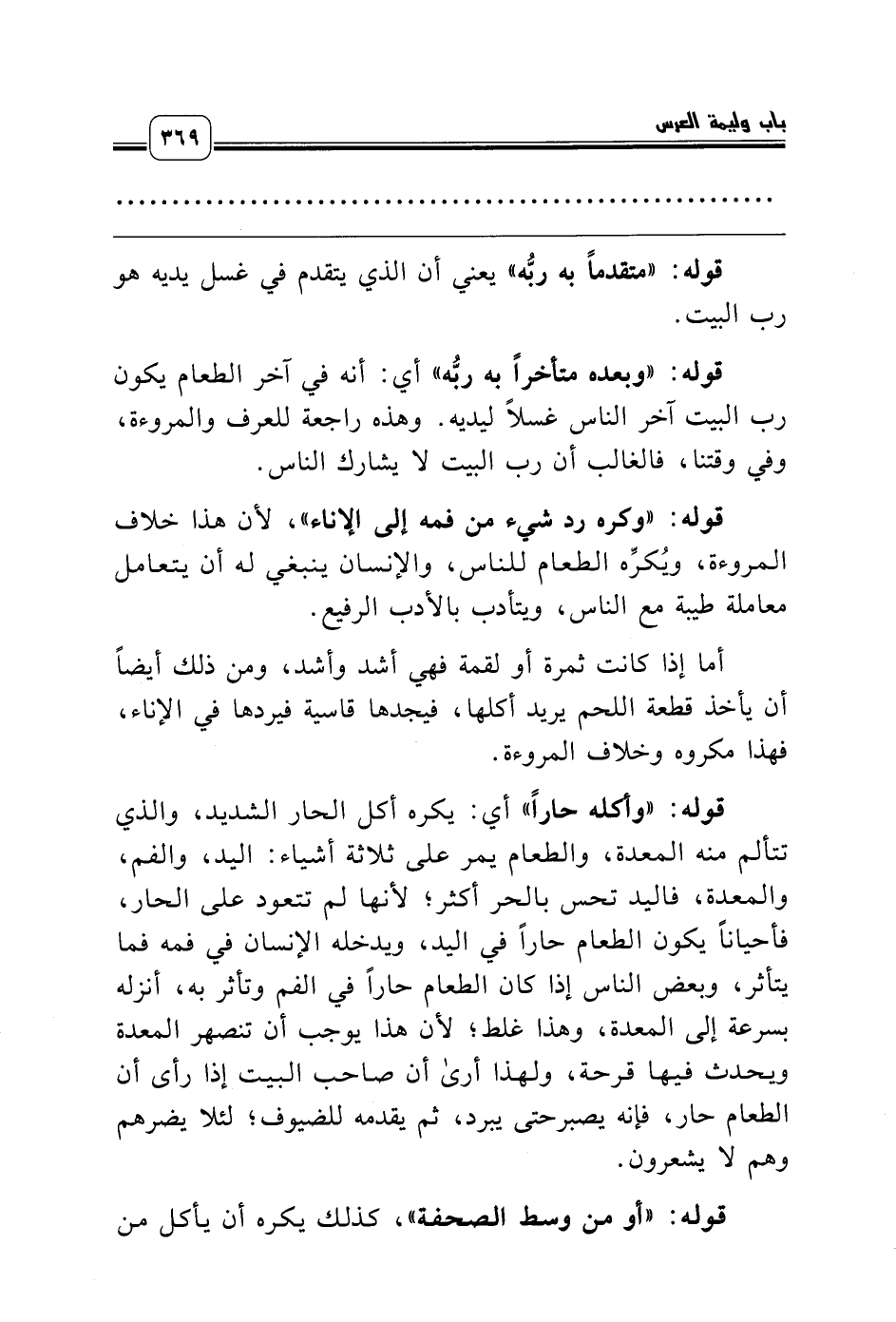 قوله: «وأكله حاراً» أي: يكره أكل الحار الشديد، والذي تتألم منه المعدة، والطعام يمر على ثلاثة أشياء: اليد، والفم، والمعدة، فاليد تحس بالحر أكثر؛ لأنها لم تتعود على الحار، فأحياناً يكون الطعام حاراً في اليد، ويدخله الإنسان في فمه فما يتأثر، وبعض الناس إذا كان الطعام حاراً في الفم وتأثر به، أنزله بسرعة إلى المعدة، وهذا غلط؛ لأن هذا يوجب أن تنصهر المعدة ويحدث فيها قرحة، ولهذا أرى أن صاحب البيت إذا رأى أن الطعام حار، فإنه يصبرحتى يبرد، ثم يقدمه للضيوف؛ لئلا يضرهم وهم لا يشعرون.