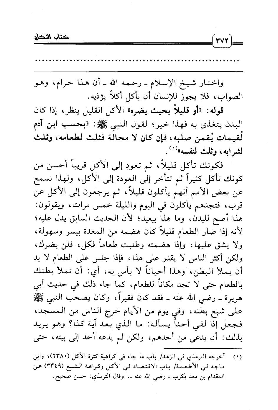 فكونك تأكل قليلاً، ثم تعود إلى الأكل قريباً أحسن من كونك تأكل كثيراً ثم تتأخر إلى العودة إلى الأكل، ولهذا نسمع عن بعض الأمم أنهم يأكلون قليلاً، ثم يرجعون إلى الأكل عن قرب، فتجدهم يأكلون في اليوم والليلة خمس مرات، ويقولون: هذا أصح للبدن، وما هذا ببعيد؛ لأن الحديث السابق يدل عليه؛ لأنه إذا صار الطعام قليلاً كان هضمه من المعدة بيسر وسهولة، ولا يشق عليها، وإذا هضمته وطلبت طعاماً فكل، فلن يضرك، ولكن أكثر الناس لا يقدر على هذا، فإذا جلس على الطعام لا بد أن يملأ البطن، وهذا أحياناً لا بأس به، أي: أن تملأ بطنك بالطعام حتى لا تجد مكاناً للطعام، كما جاء ذلك في حديث أبي هريرة ـ رضي الله عنه ـ فقد كان فقيراً، وكان يصحب النبي صلّى الله عليه وسلّم على شبع بطنه، وفي يوم من الأيام خرج الناس من المسجد، فجعل إذا لقي أحداً يسأله: ما الذي بعد آية كذا؟ وهو يريد بذلك: أن يدعى من أحدهم، ولكن لم يدعه أحد إلى بيته، حتى