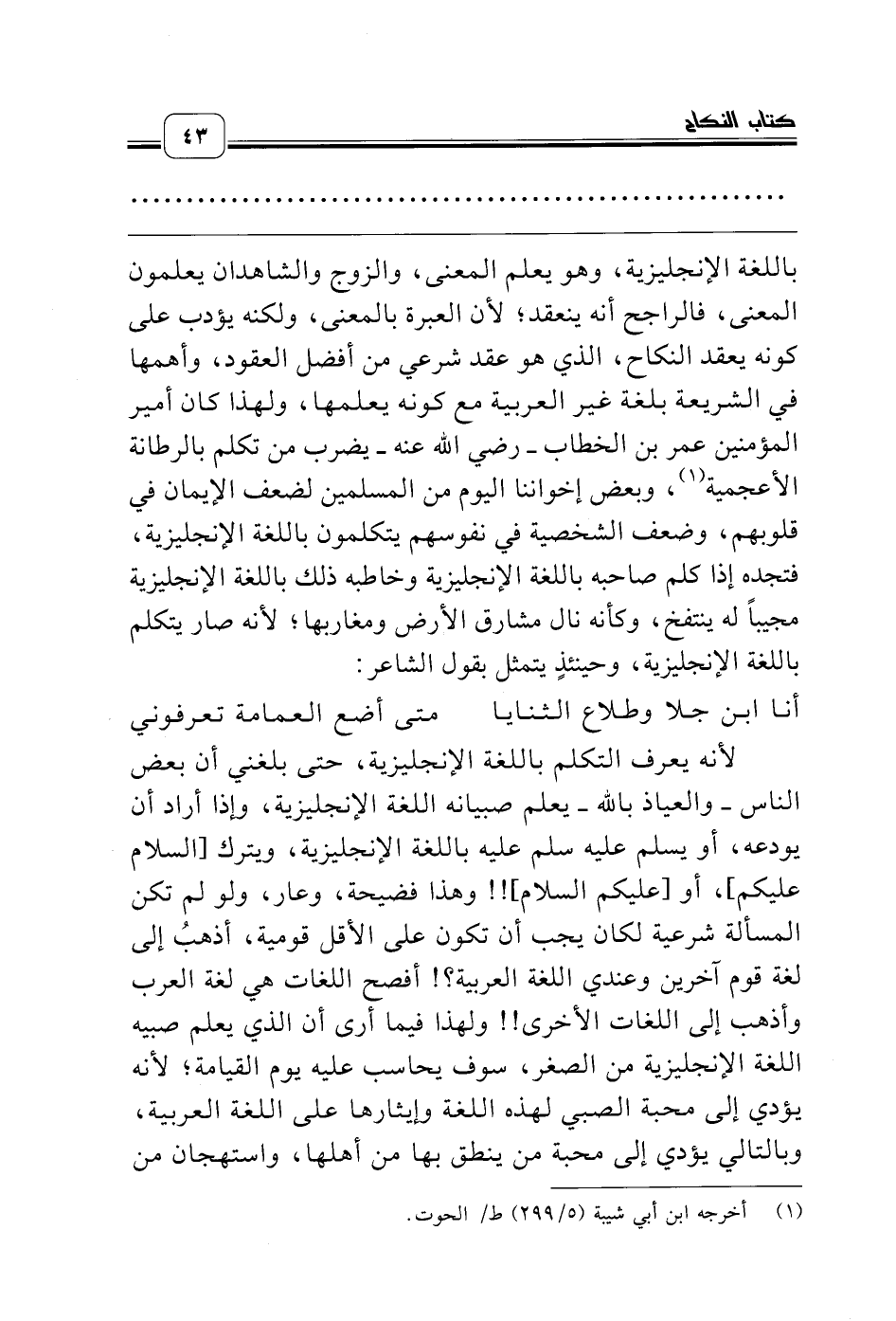 باللغة الإنجليزية، وهو يعلم المعنى، والزوج والشاهدان يعلمون المعنى، فالراجح أنه ينعقد؛ لأن العبرة بالمعنى، ولكنه يؤدب على كونه يعقد النكاح، الذي هو عقد شرعي من أفضل العقود، وأهمها في الشريعة بلغة غير العربية مع كونه يعلمها، ولهذا كان أمير المؤمنين عمر بن الخطاب ـ رضي الله عنه ـ يضرب من تكلم بالرطانة الأعجمية (¬1)، وبعض إخواننا اليوم من المسلمين لضعف الإيمان في قلوبهم، وضعف الشخصية في نفوسهم يتكلمون باللغة الإنجليزية، فتجده إذا كلم صاحبه باللغة الإنجليزية وخاطبه ذلك باللغة الإنجليزية مجيباً له ينتفخ، وكأنه نال مشارق الأرض ومغاربها؛ لأنه صار يتكلم باللغة الإنجليزية، وحينئذٍ يتمثل بقول الشاعر: